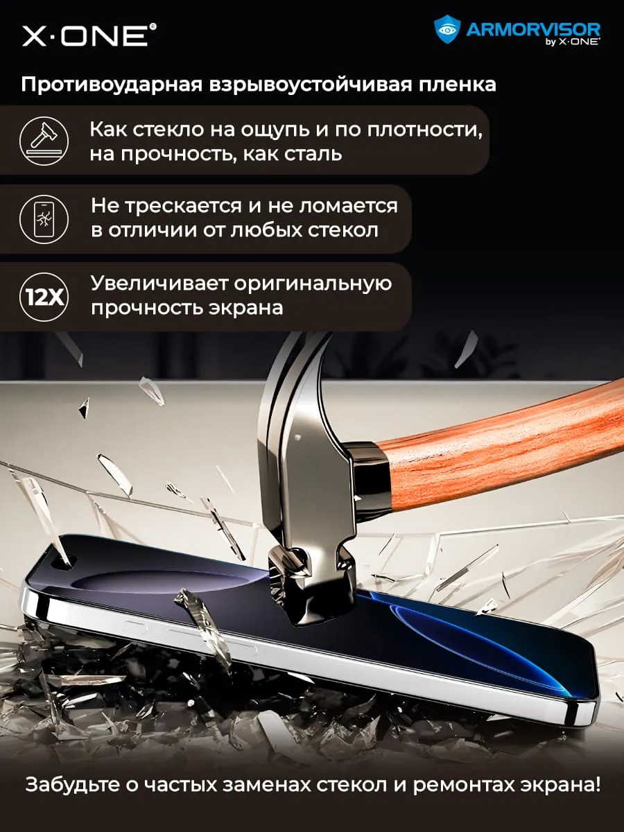 Противоударная бронепленка X-ONE Armorvisor 4-го поколения, толщиной всего 0.2мм., на ощупь и по плотности, как стекло — защитная пленка с фильтрацией ультрафиолетового излучения экрана.