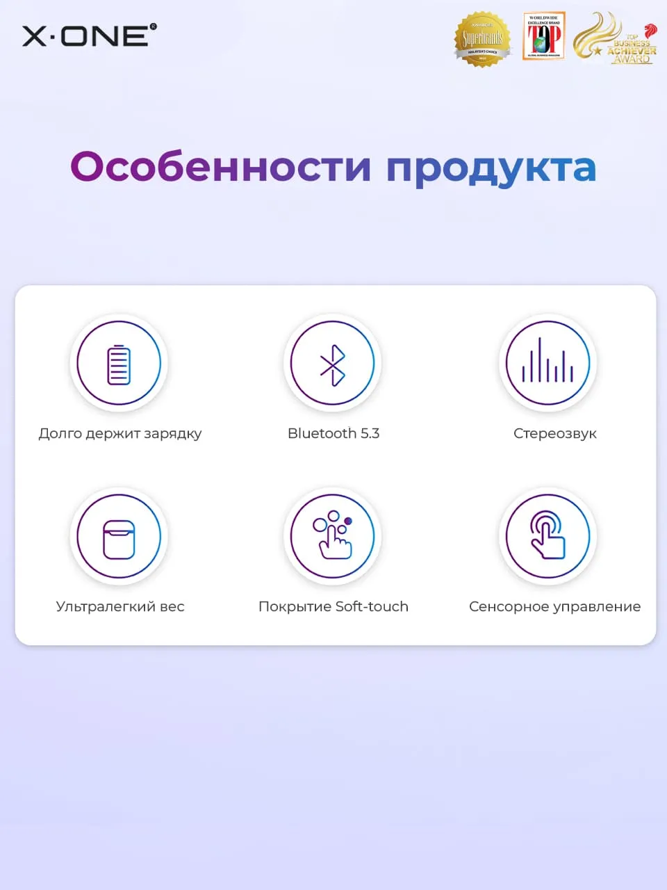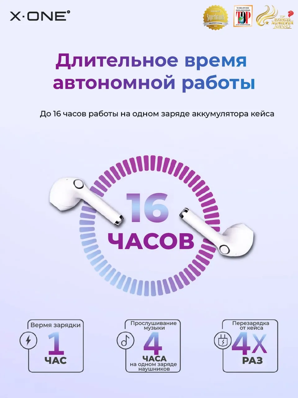 - Комплектация: Фирменная упаковка X-ONE, беспроводные наушники - 2 шт., кабель Type-C - USB - 1 шт., кейс подзарядный для беспроводных наушников - 1 шт.