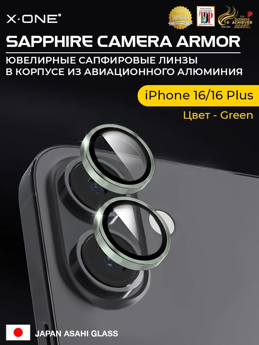 Сапфировое стекло на камеру iPhone 16/16 Plus X-ONE Camera Armor - цвет Green / линзы / авиа-алюминиевый корпус