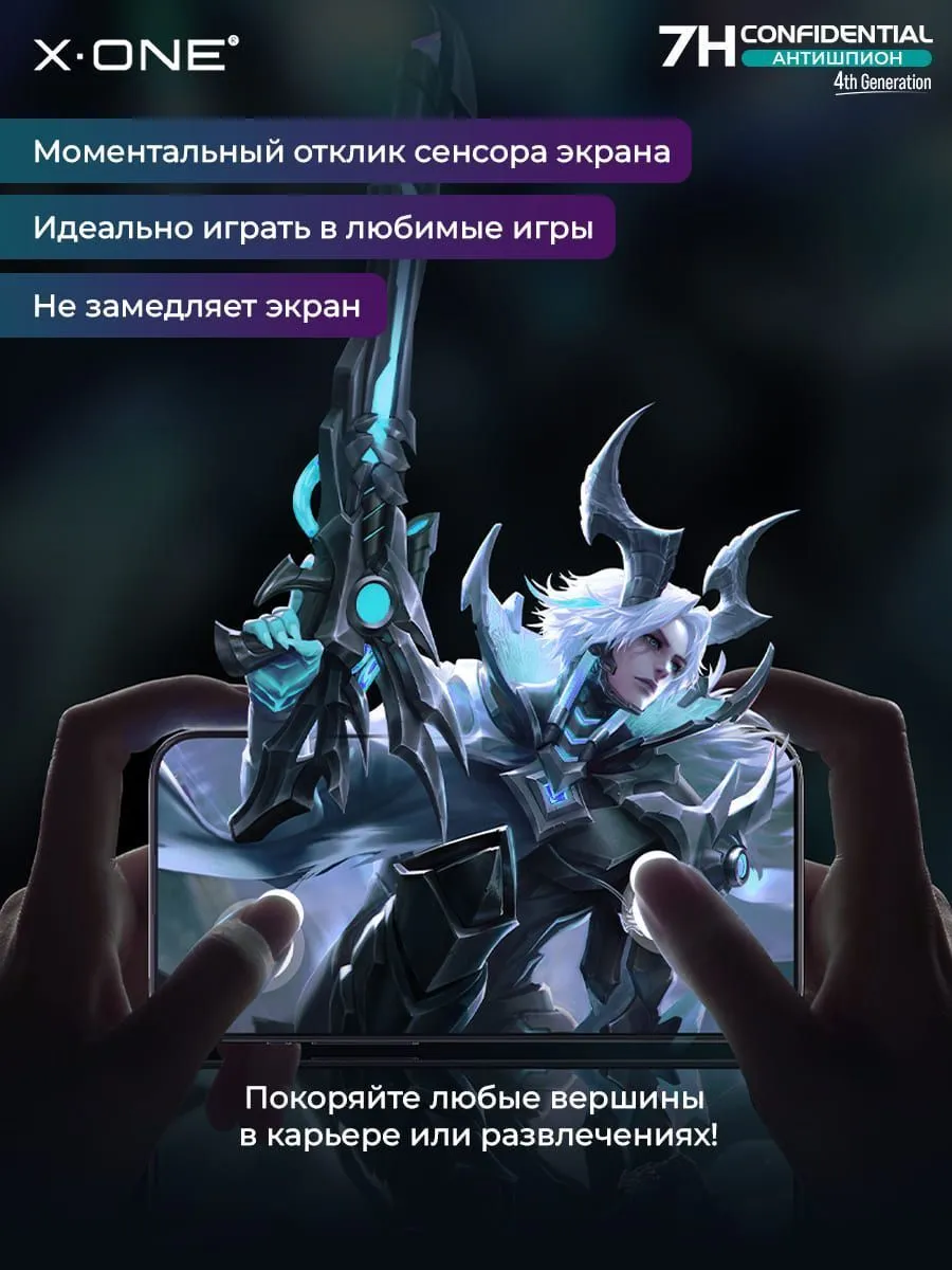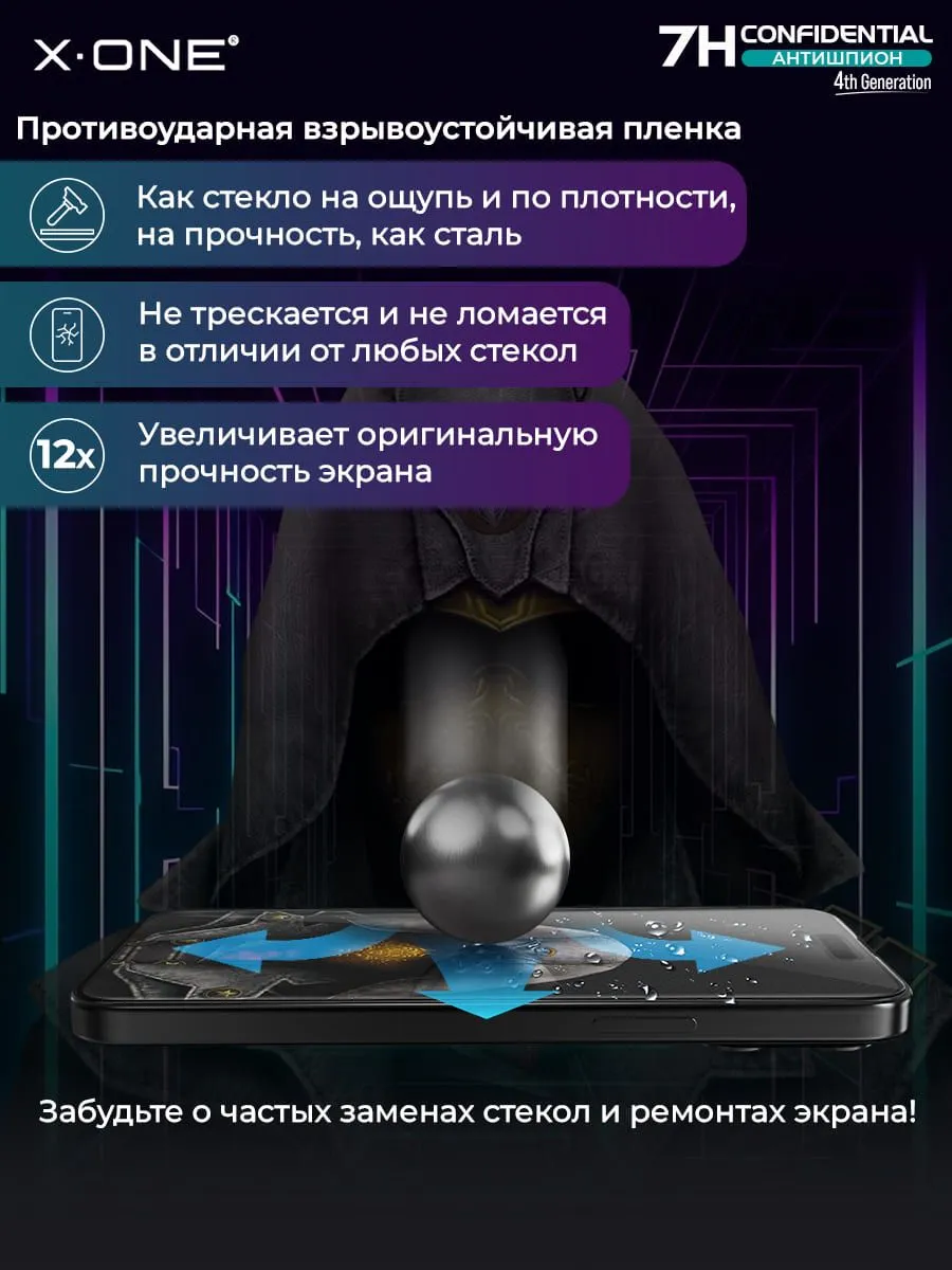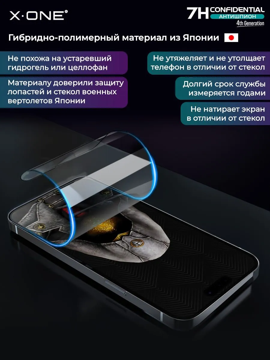 Противоударная бронепленка X-ONE Confidential 4-го поколения — Антишпион / с защитой от подглядывания, толщиной 0.24мм., на ощупь и по плотности, как стекло — пленка антишпион.