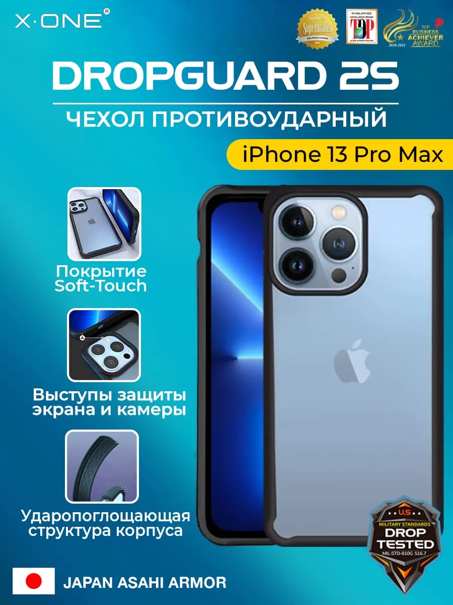 Чехол iPhone 13 Pro Max X-ONE DropGuard 2S - прозрачная задняя панель и черный матовый Soft Touch бампер