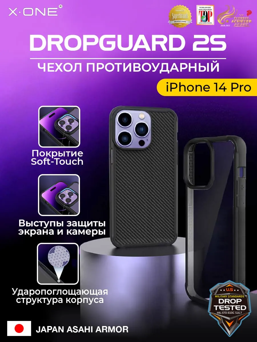 Чехол iPhone 14 Pro X-ONE DropGuard 2S - прозрачная задняя панель и черный матовый Soft Touch бампер