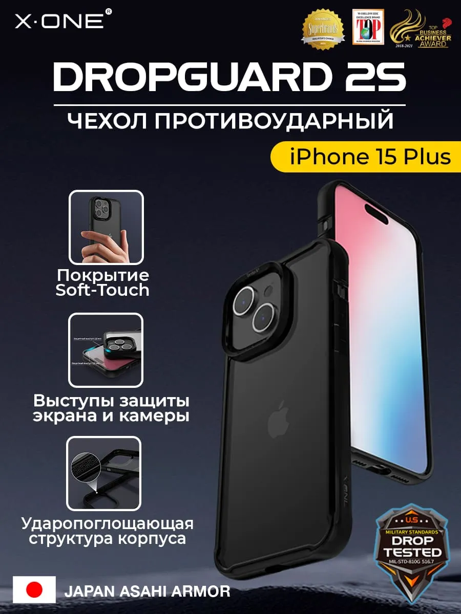 Чехол iPhone 15 Plus X-ONE DropGuard 2S - прозрачная задняя панель и черный матовый Soft Touch бампер