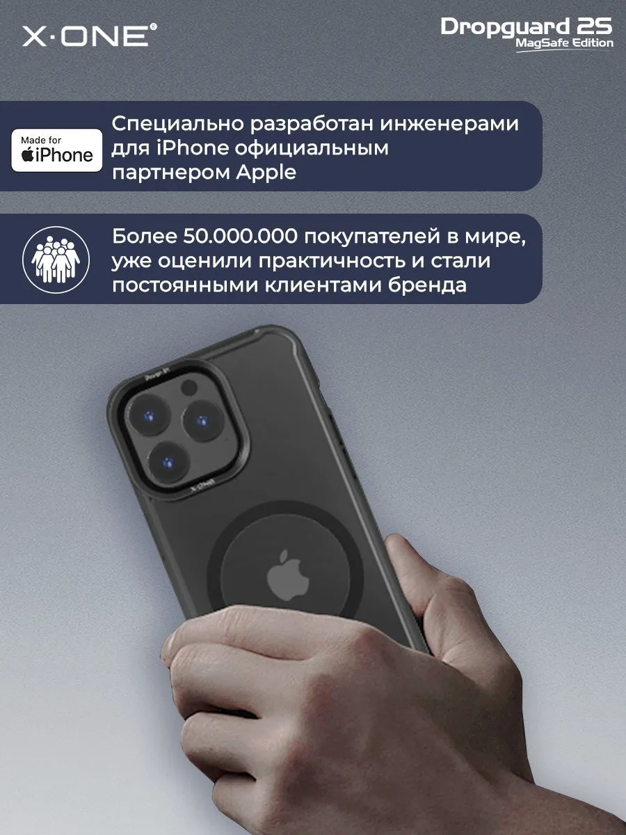 Противоударный чехол X-ONE DropGuard 2S MagSafe edition с прозрачной задней панелью, черным матовым Soft-Touch бампером и магнитом MagSafe + в комплекте карбоновый стикер для установки на заднюю панель по усмотрению.