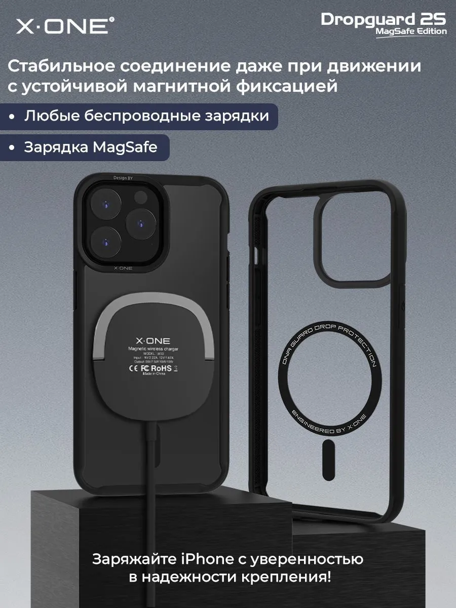 Противоударный чехол X-ONE DropGuard 2S с прозрачной задней панелью, черным матовым Soft-Touch бампером и магнитом MagSafe для беспроводной зарядки + в комплекте карбоновый стикер для установки на заднюю панель по усмотрению.