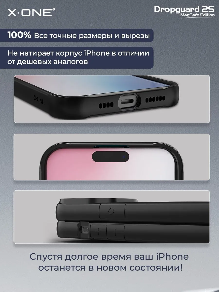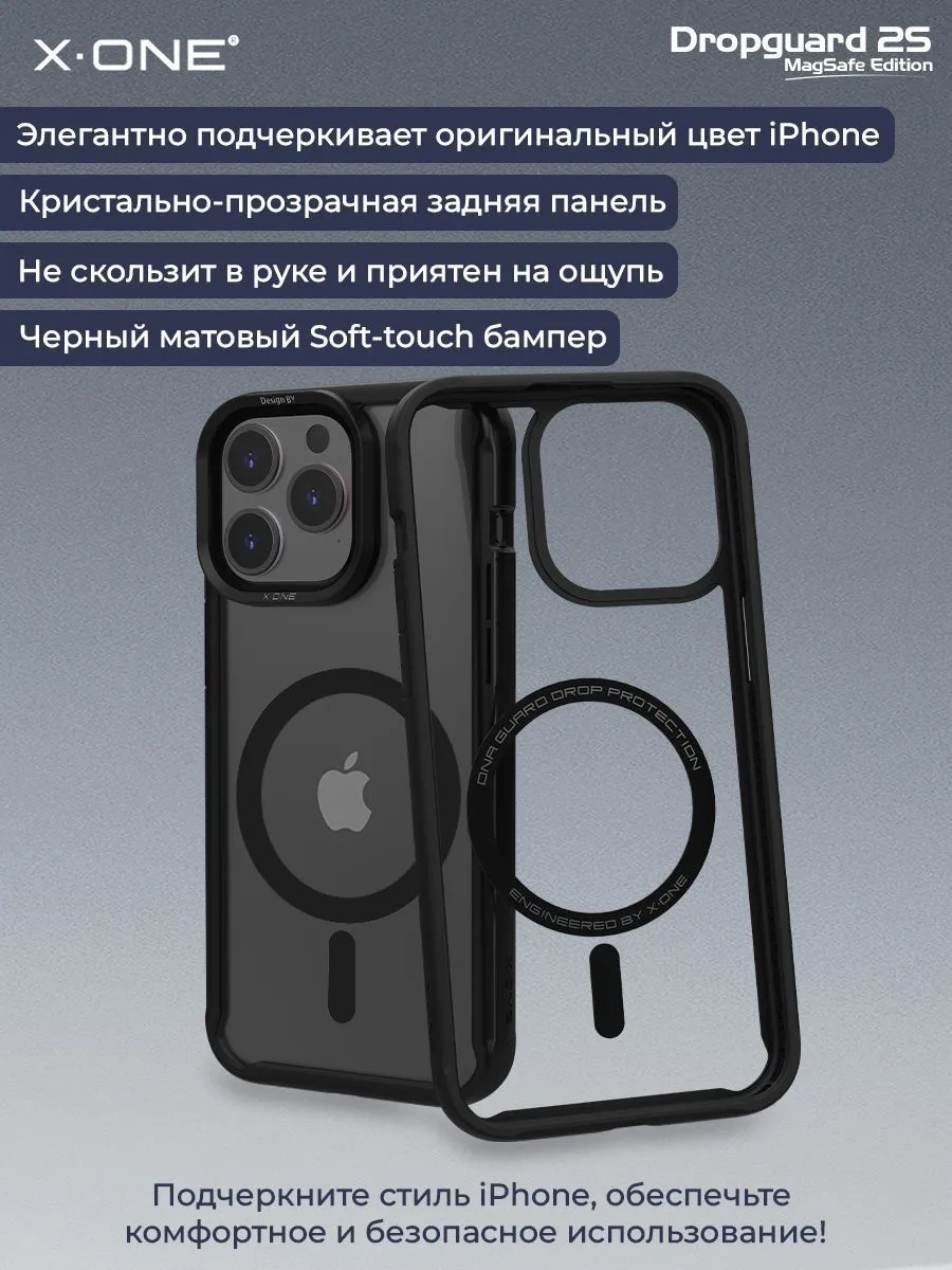 Противоударный чехол X-ONE DropGuard 2S с прозрачной задней панелью, черным матовым Soft-Touch бампером и магнитом MagSafe для беспроводной зарядки + в комплекте карбоновый стикер для установки на заднюю панель по усмотрению.