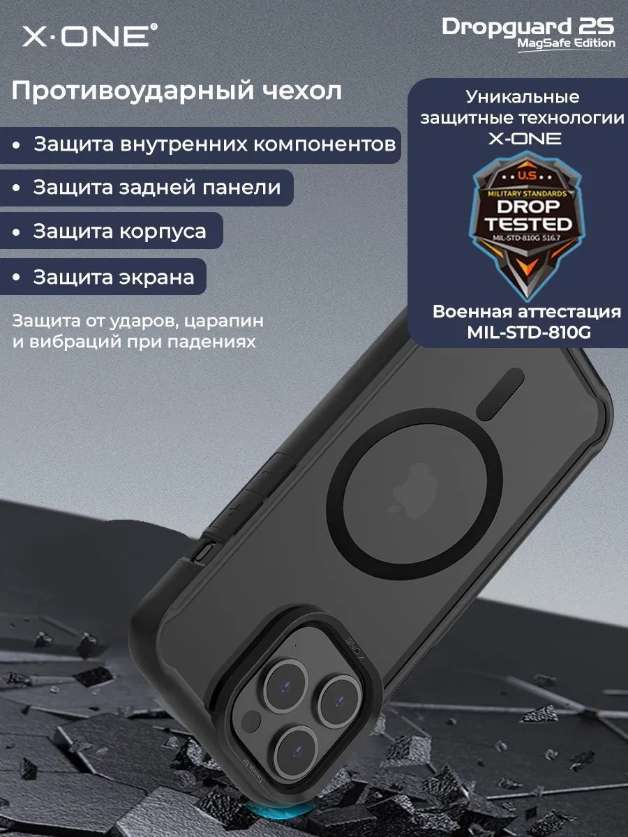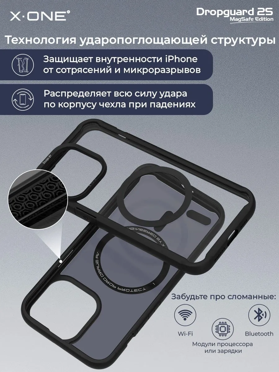 Противоударный чехол X-ONE DropGuard 2S MagSafe edition с прозрачной задней панелью, черным матовым Soft-Touch бампером и магнитом MagSafe + в комплекте карбоновый стикер для установки на заднюю панель по усмотрению.
