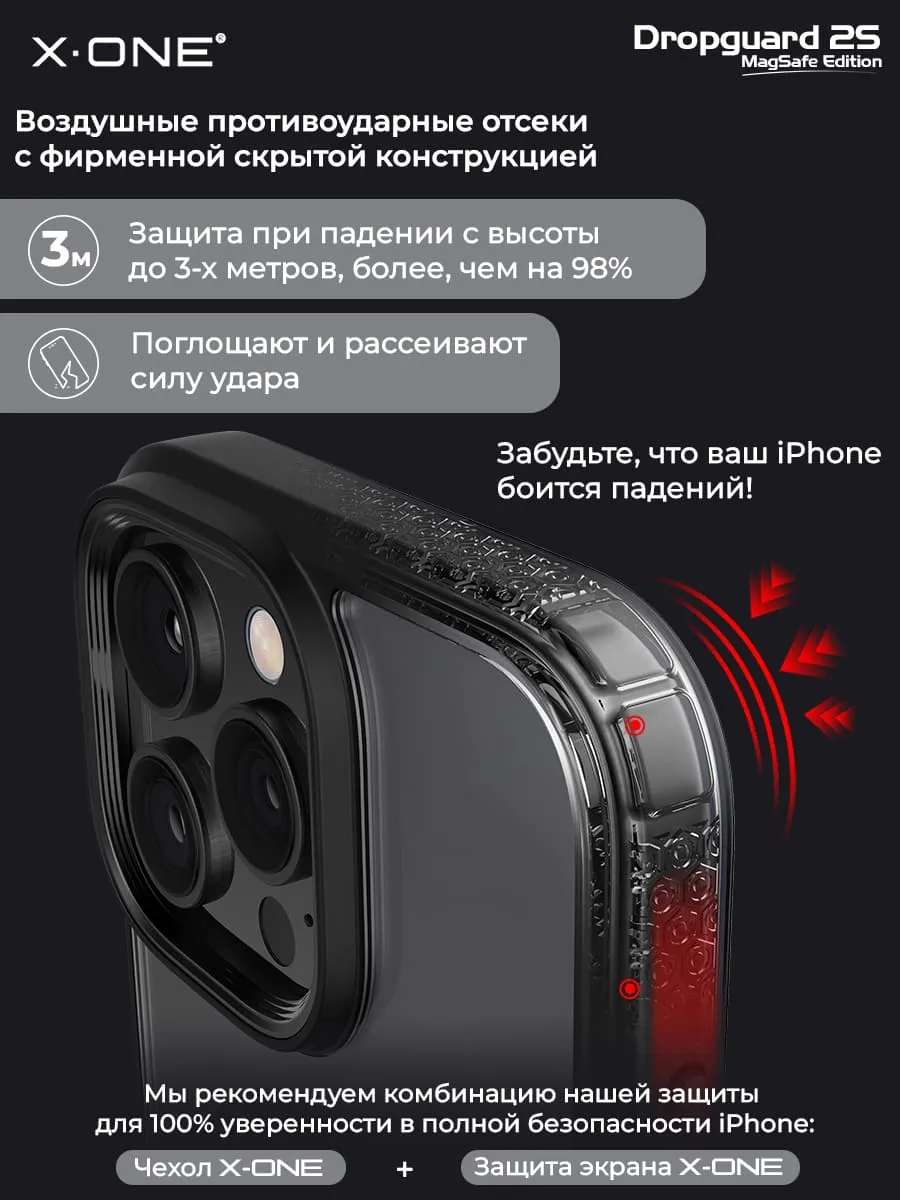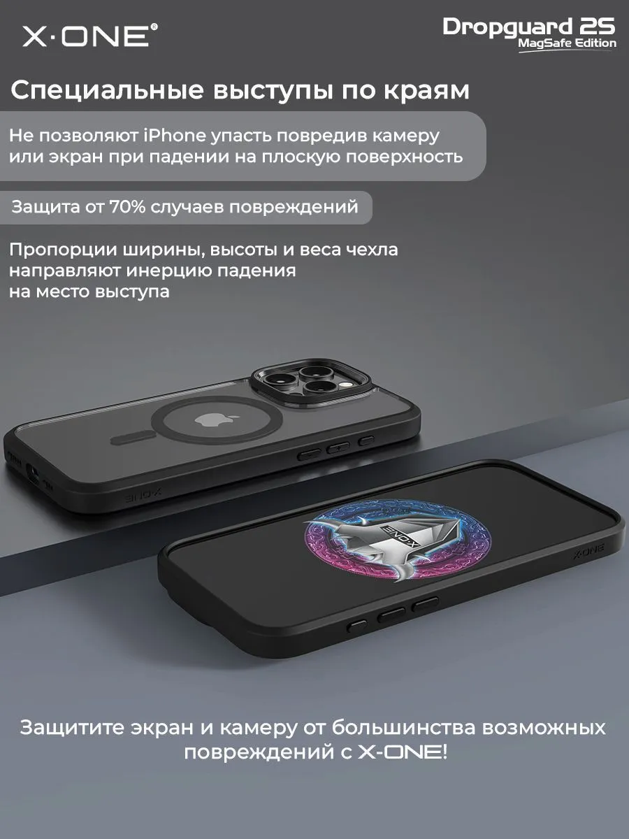 Противоударный чехол X-ONE DropGuard 2S с прозрачной задней панелью, черным матовым Soft-Touch бампером и магнитом MagSafe для беспроводной зарядки + в комплекте карбоновый стикер для установки на заднюю панель по усмотрению.