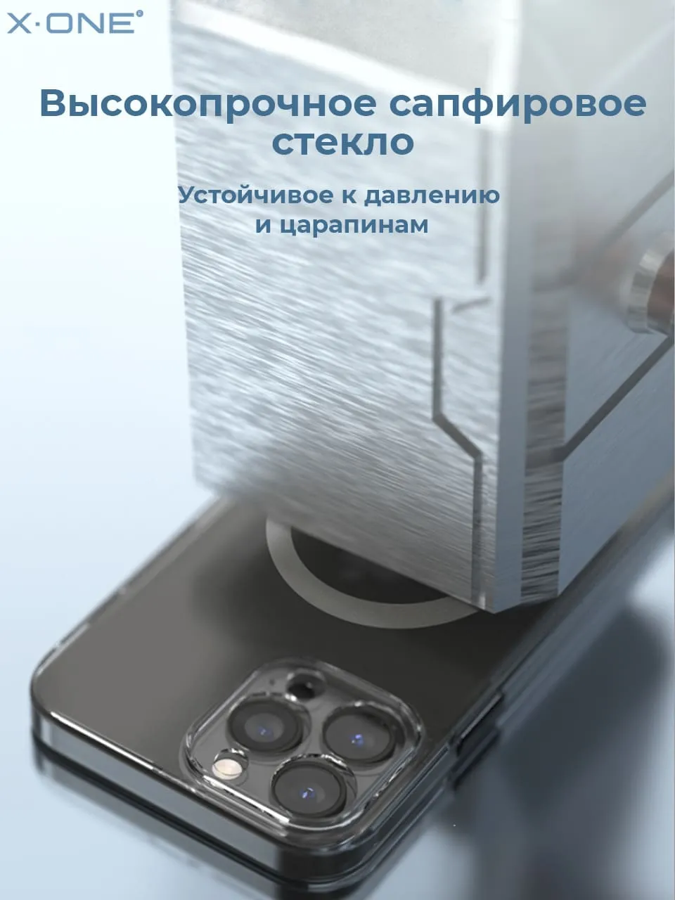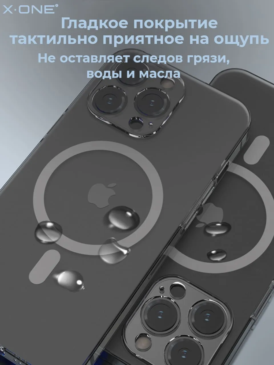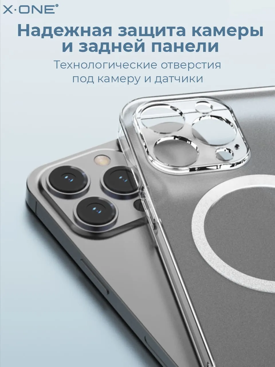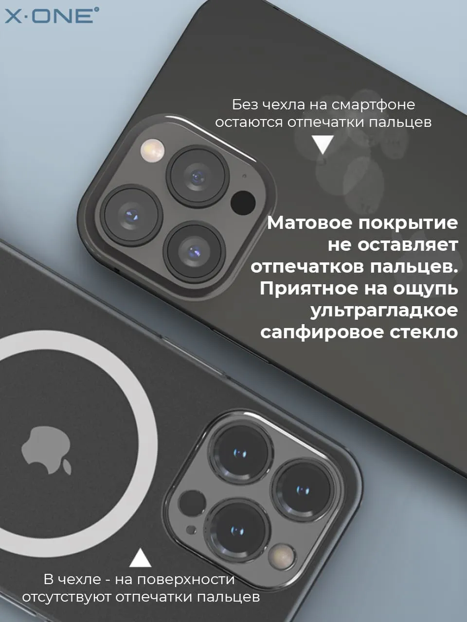 Прозрачный чехол X-ONE Dropguard Matte Glass MagSafe edition с закрытым блоком камеры, матовой задней панелью из сапфирового стекла и магнитом MagSafe.