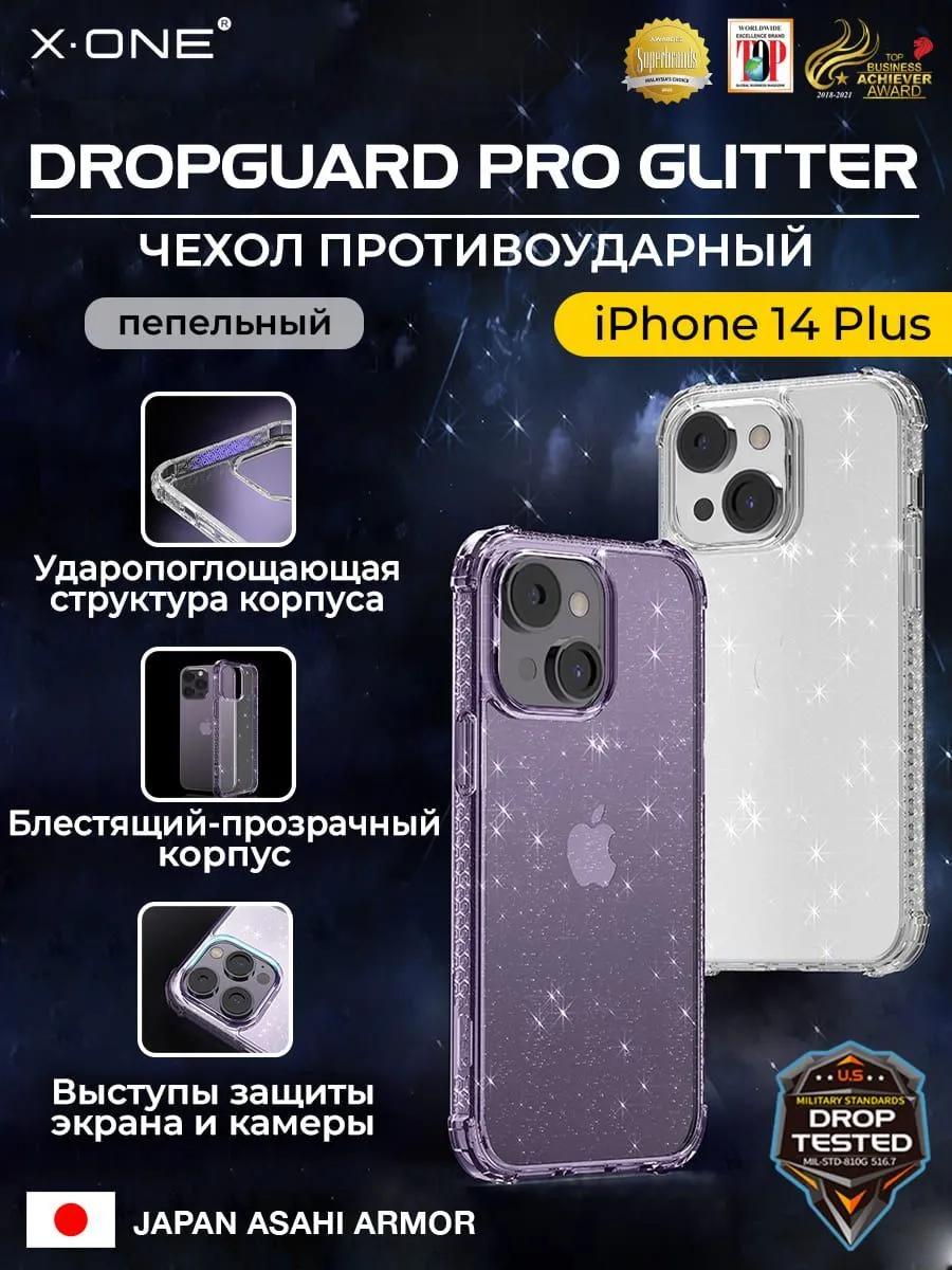 Чехол iPhone 14 Pro X-ONE DropGuard PRO Glitter - блестящий текстурированный-прозрачный корпус пепельного оттенка