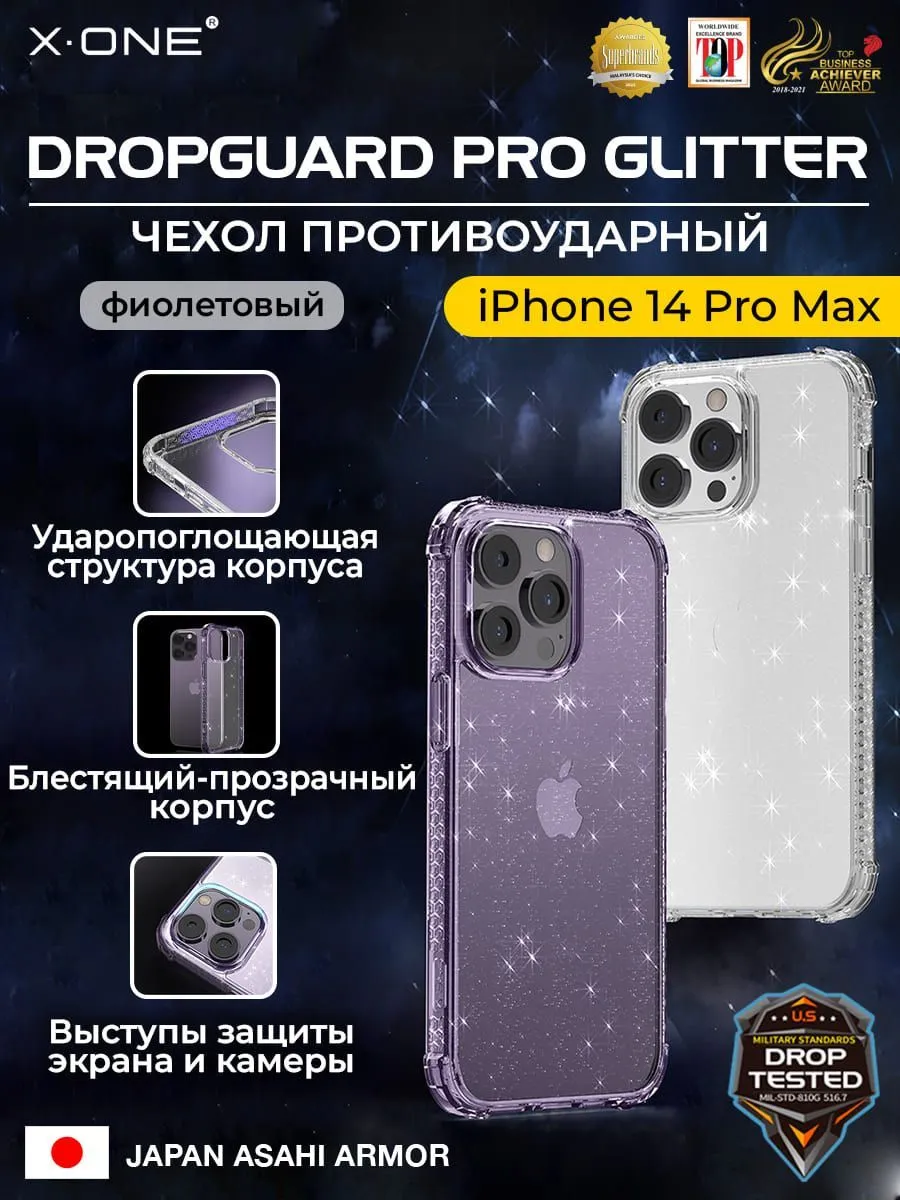 Чехол iPhone 14 Pro Max X-ONE DropGuard PRO Glitter - блестящий текстурированный-прозрачный корпус фиолетового оттенка