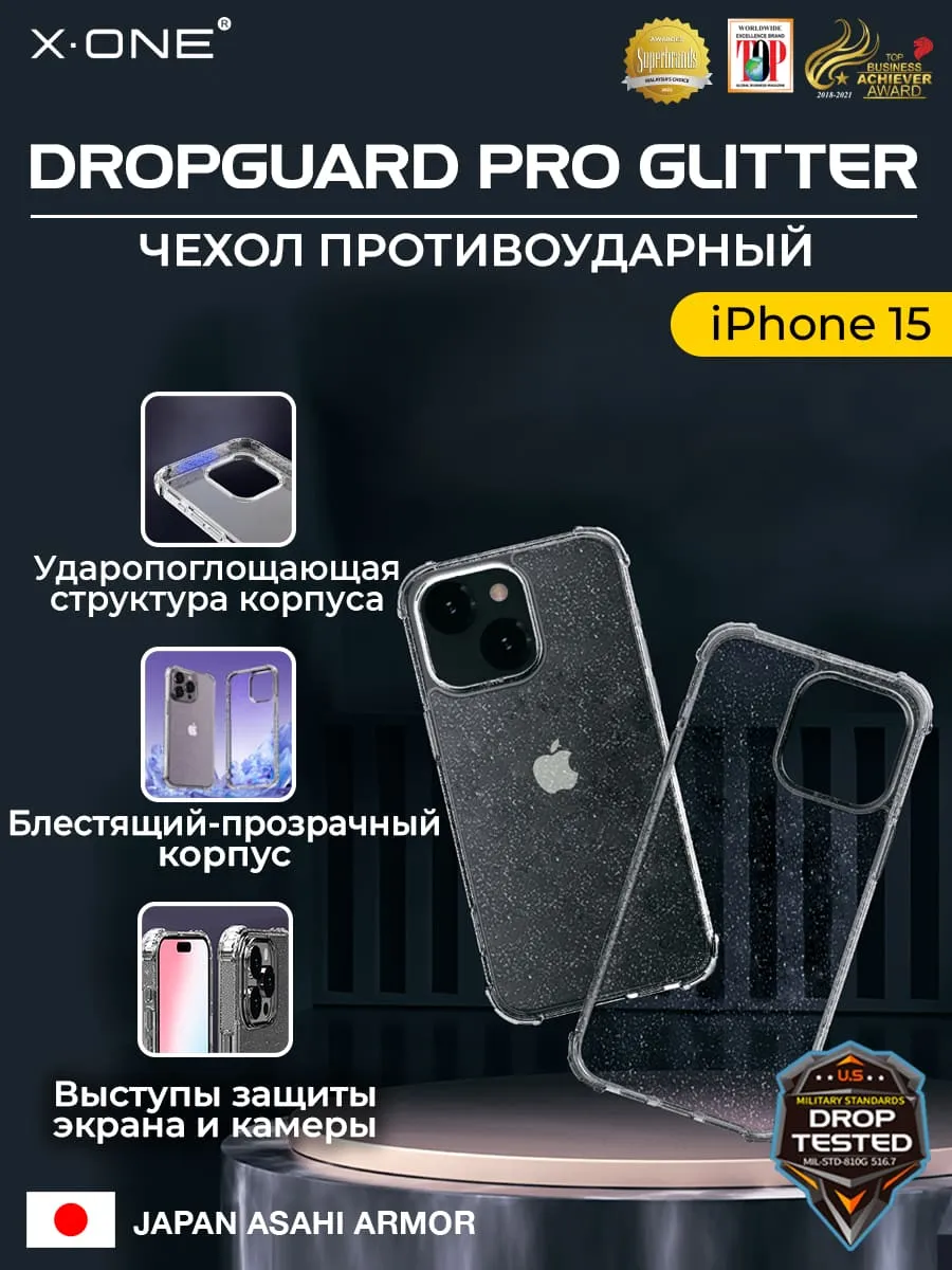 Чехол iPhone 15 X-ONE DropGuard PRO Glitter - блестящий текстурированный-прозрачный корпус пепельного оттенка