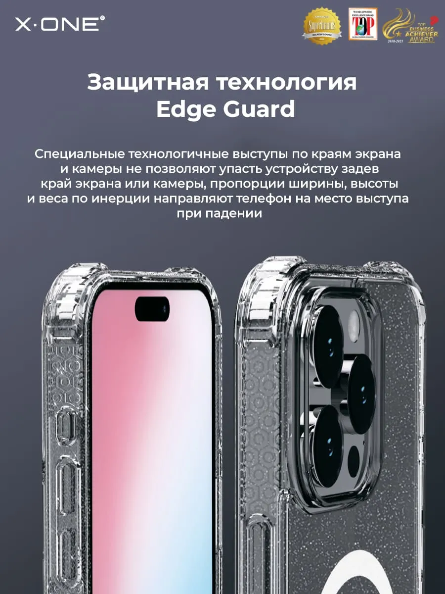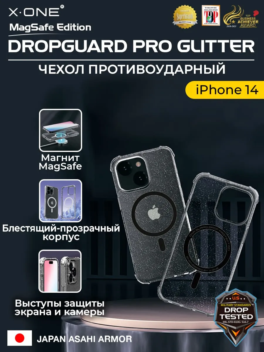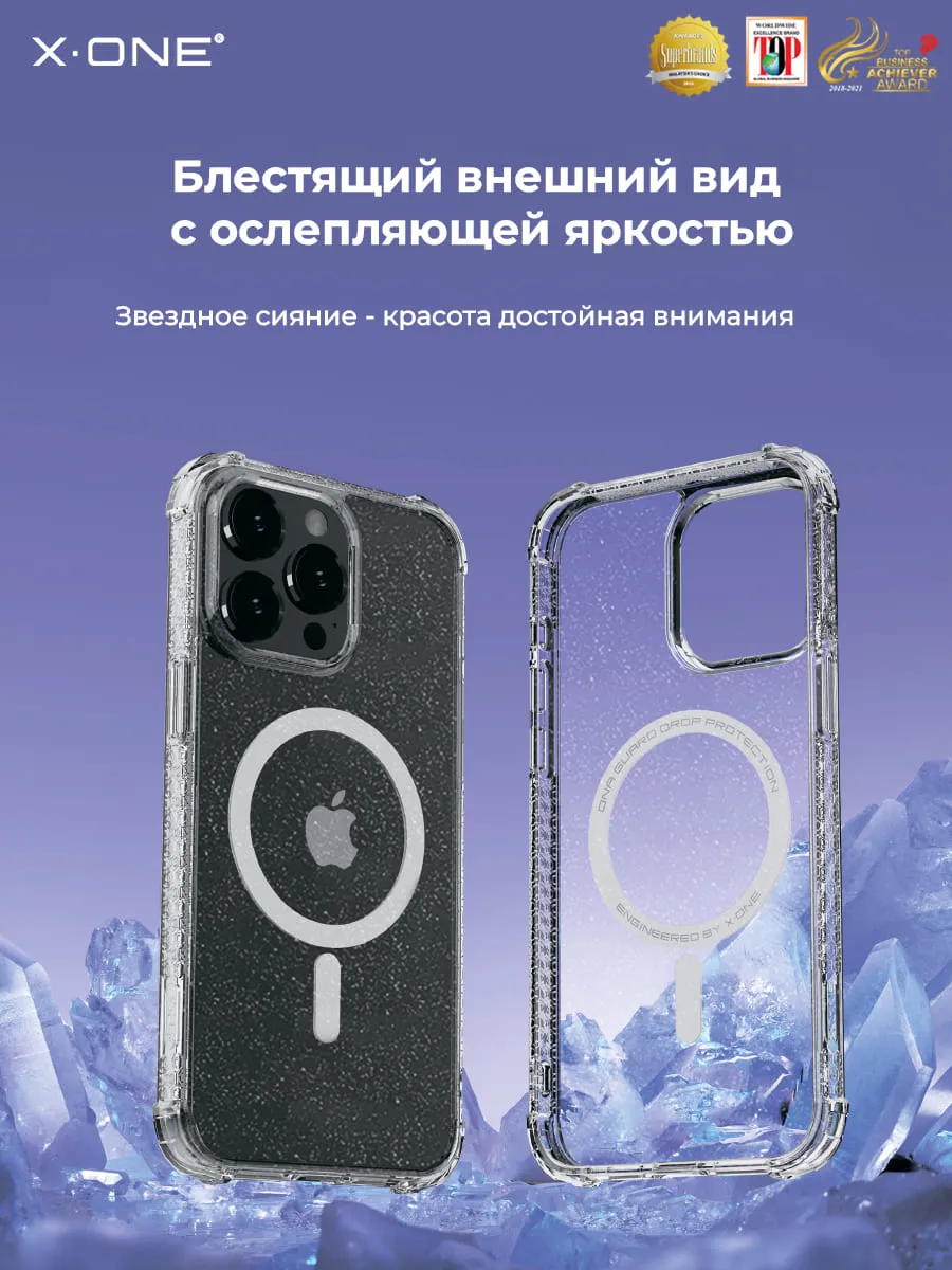 Прозрачный - блестящий чехол X-ONE DropGuard PRO Glitter MagSafe edition с текстурированным боковым корпусом и магнитом MagSafe.