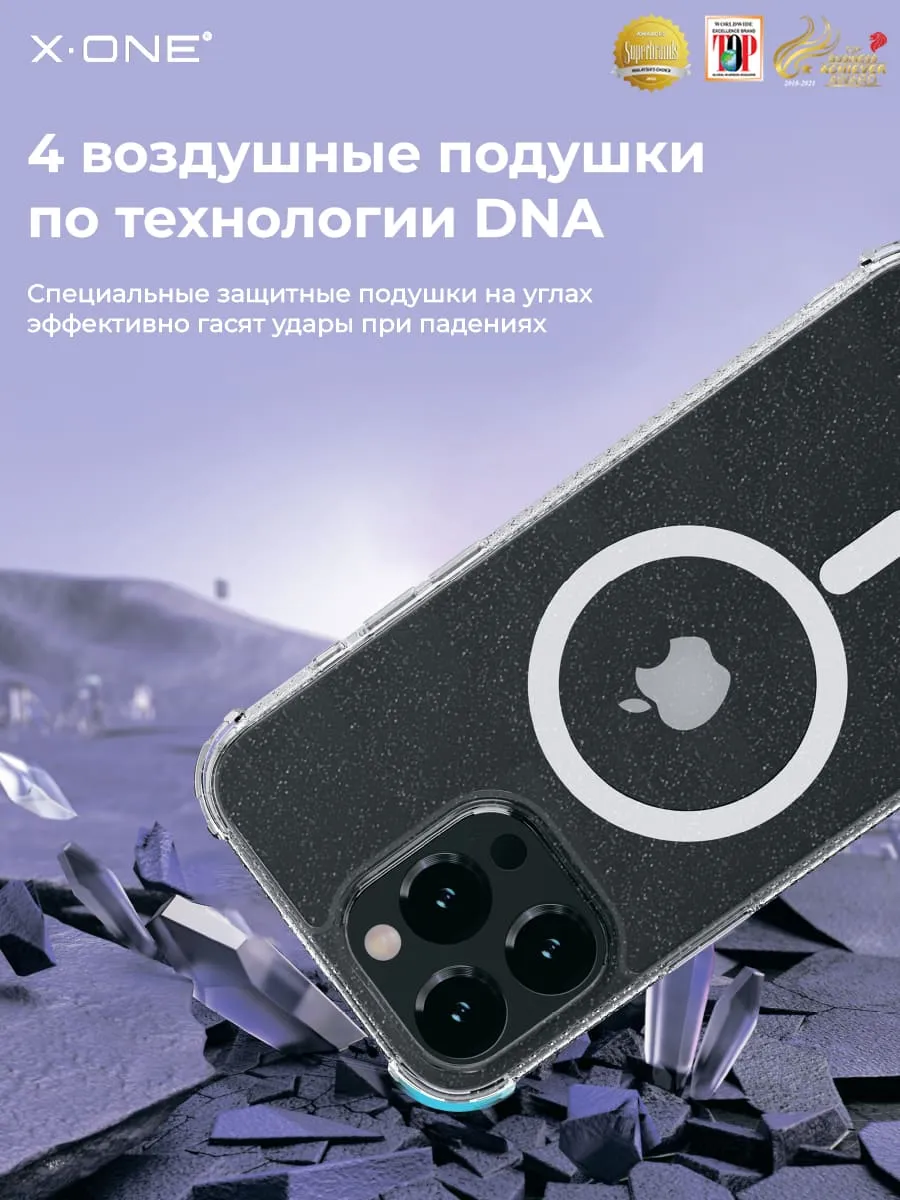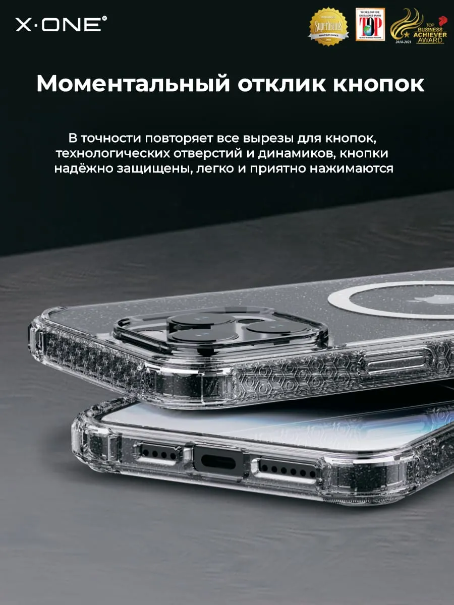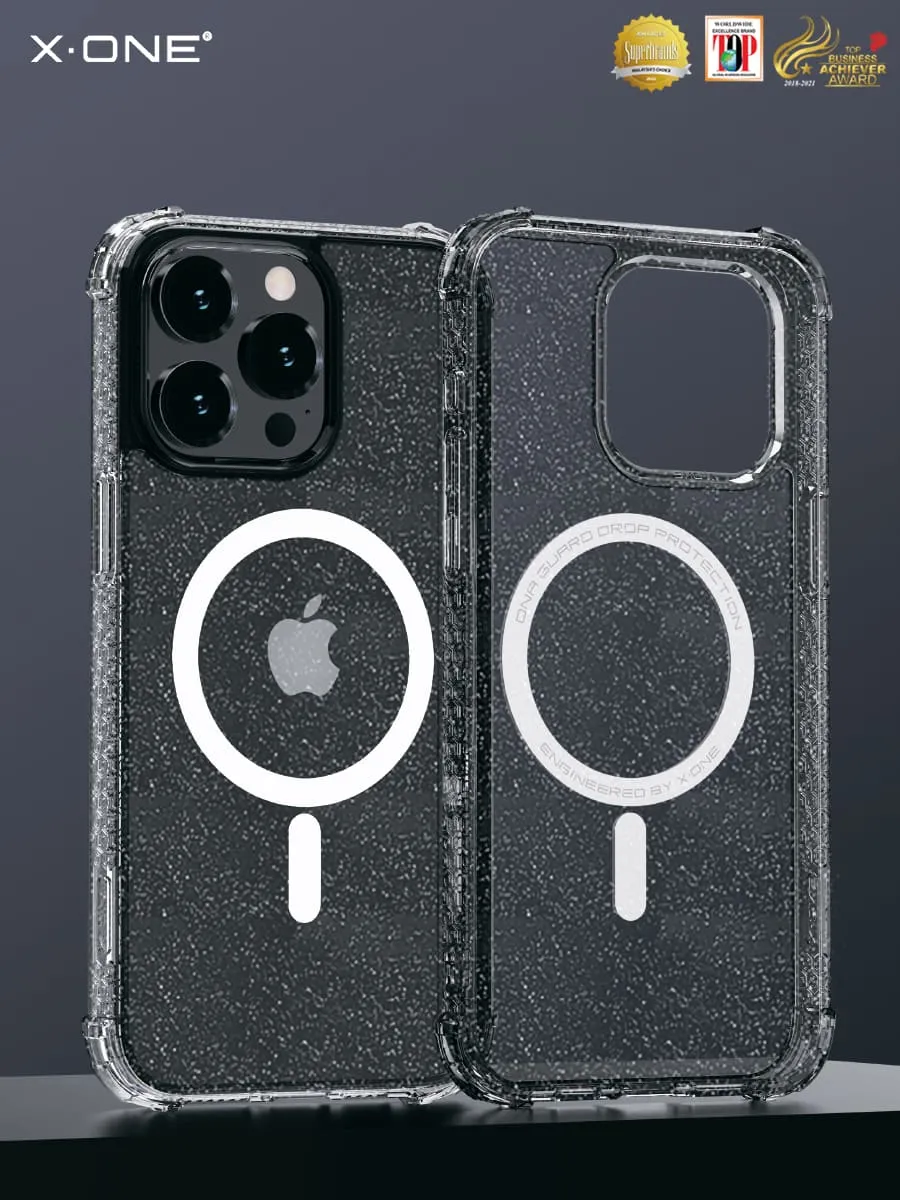 Прозрачный - блестящий чехол X-ONE DropGuard PRO Glitter с текстурированным боковым корпусом с блестками и магнитом MagSafe для беспроводной зарядки.