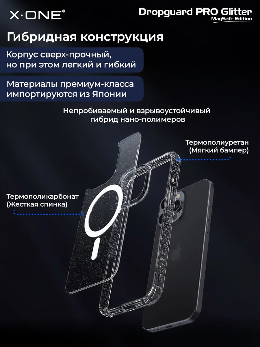 Прозрачный - блестящий чехол X-ONE DropGuard PRO Glitter с текстурированным боковым корпусом с блестками и магнитом MagSafe для беспроводной зарядки.