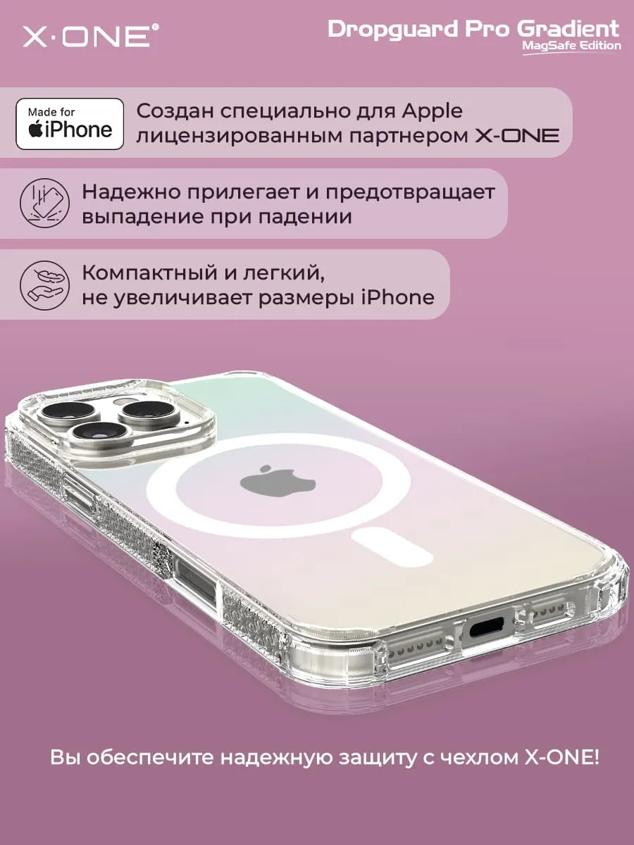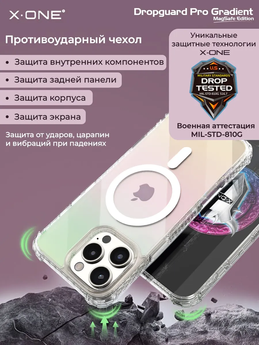 Прозрачный чехол X-ONE DropGuard PRO Gradient MagSafe с кристально-прозрачным текстурированным боковым корпусом, задней панелью палитры цветов северного сияния и магнитом MagSafe для беспроводной зарядки.