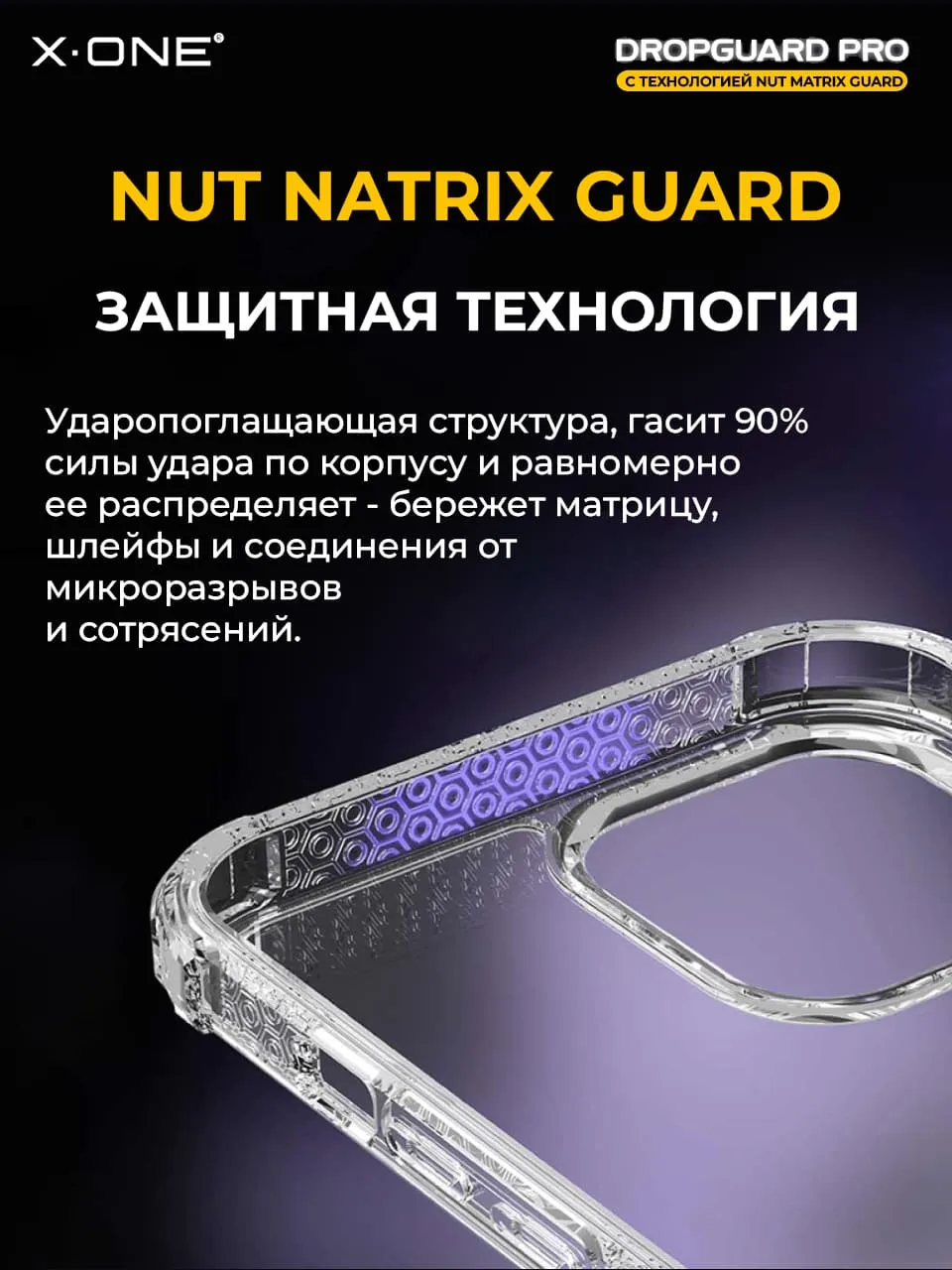 Nut Matrix Guard — воздушные отсеки с фирменной конструкцией на углах, эффективно поглощают и рассеивают силу удара при падении с высоты до 6-и метров, более, чем на 98%.
