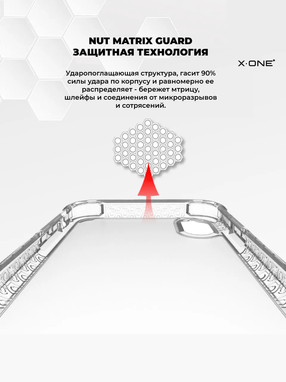Nut Matrix Guard — технология ударопоглощающей структуры, гасит 90% силы удара по корпусу и равномерно ее распределяет — защищает матрицу, шлейфы и соединения от микро-разрывов и сотрясений.