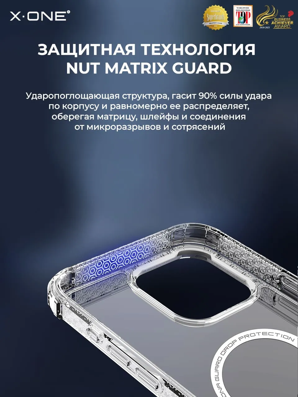 Nut Matrix Guard — технология ударопоглощающей структуры, гасит 90% силы удара по корпусу и равномерно ее распределяет — защищает матрицу, шлейфы и соединения от микро-разрывов и сотрясений.