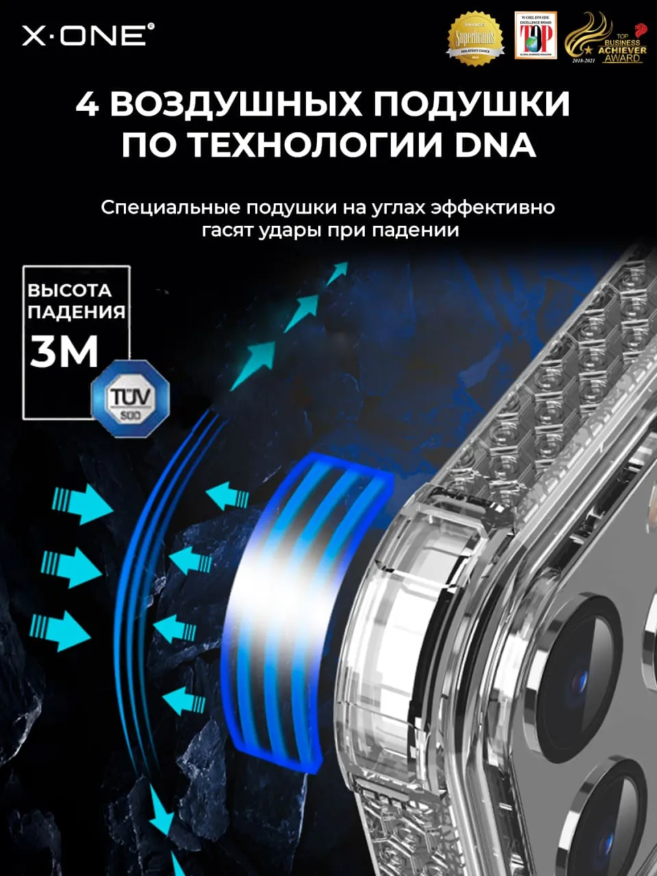 DNA — воздушные отсеки с фирменной конструкцией на углах, эффективно поглощают и рассеивают силу удара при падении с высоты до 3-х метров, более, чем на 98%.