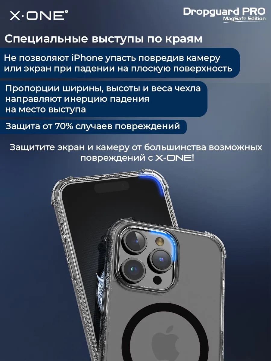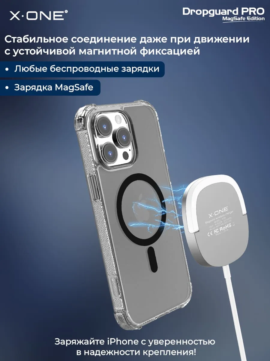 Прозрачный чехол X-ONE DropGuard PRO MagSafe с текстурированным боковым корпусом и магнитом MagSafe для беспроводной зарядки.
