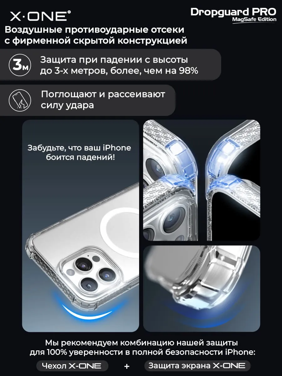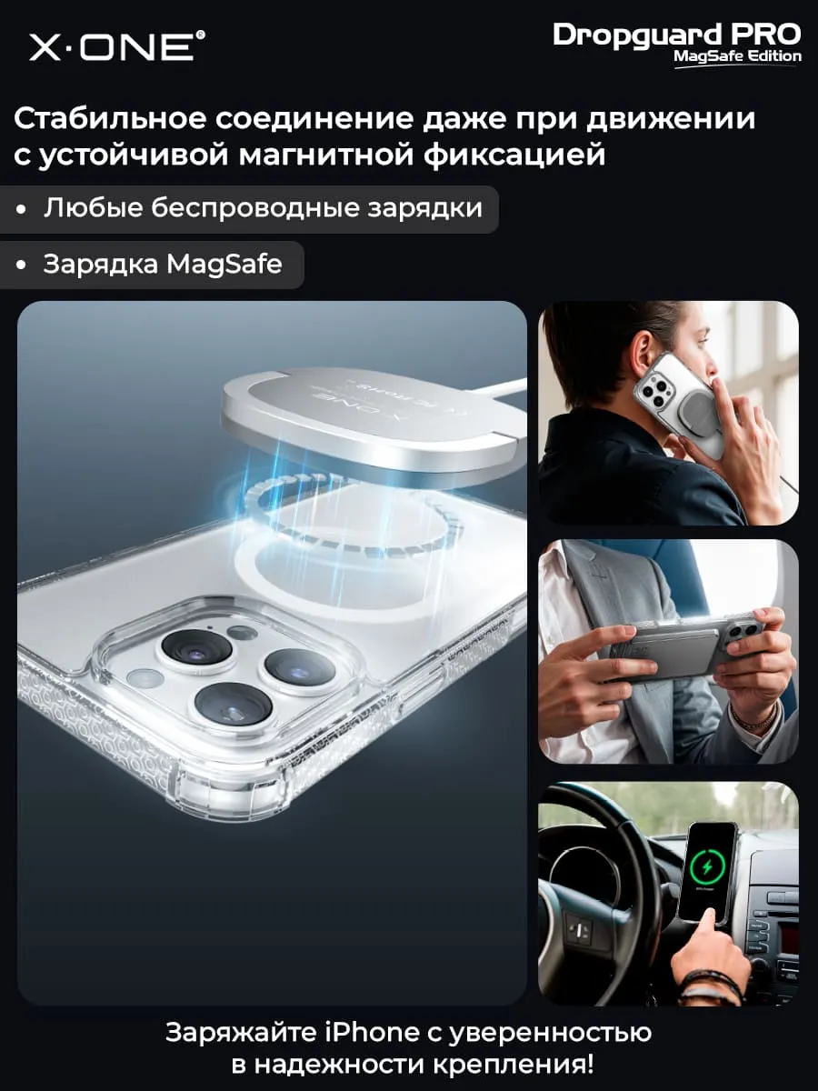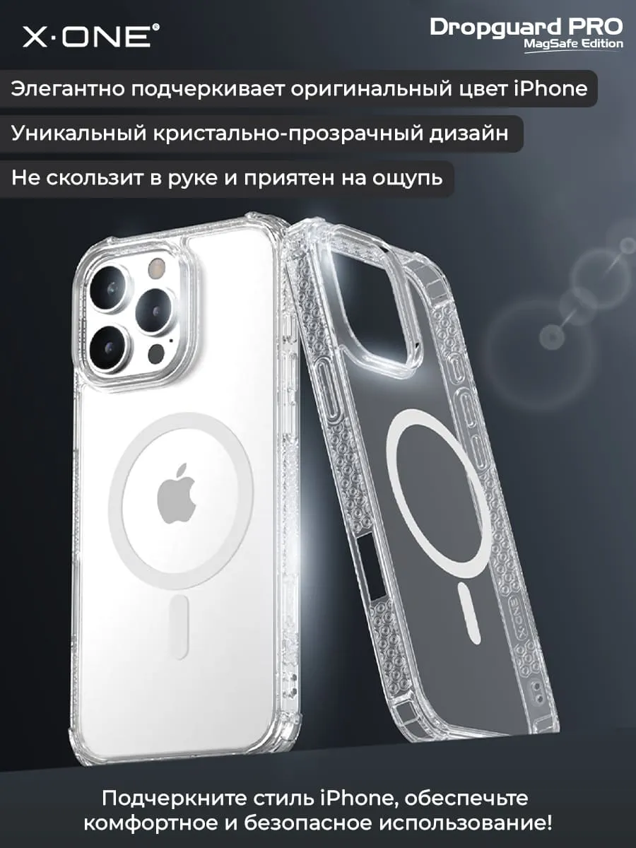 Прозрачный чехол X-ONE DropGuard PRO MagSafe edition с текстурированным боковым корпусом и магнитом MagSafe.