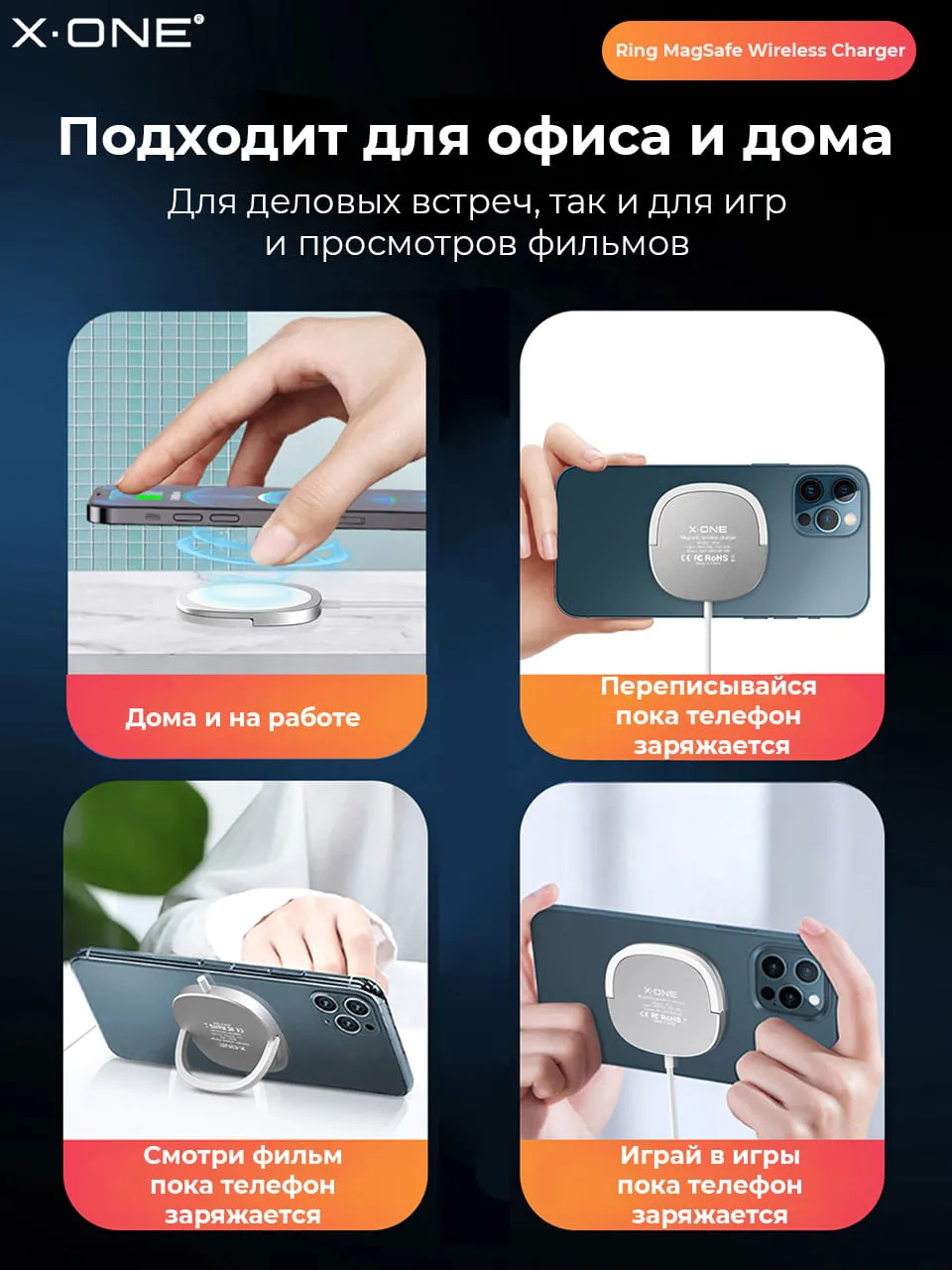 Магнитная зарядка для телефона X-ONE Magnetic Wireless Charger Wireless Charger с притягивающим магнитом и выдвижной подставкой смартфона для удобного просмотра контента во время зарядки в горизонтальном или вертикальном положении.