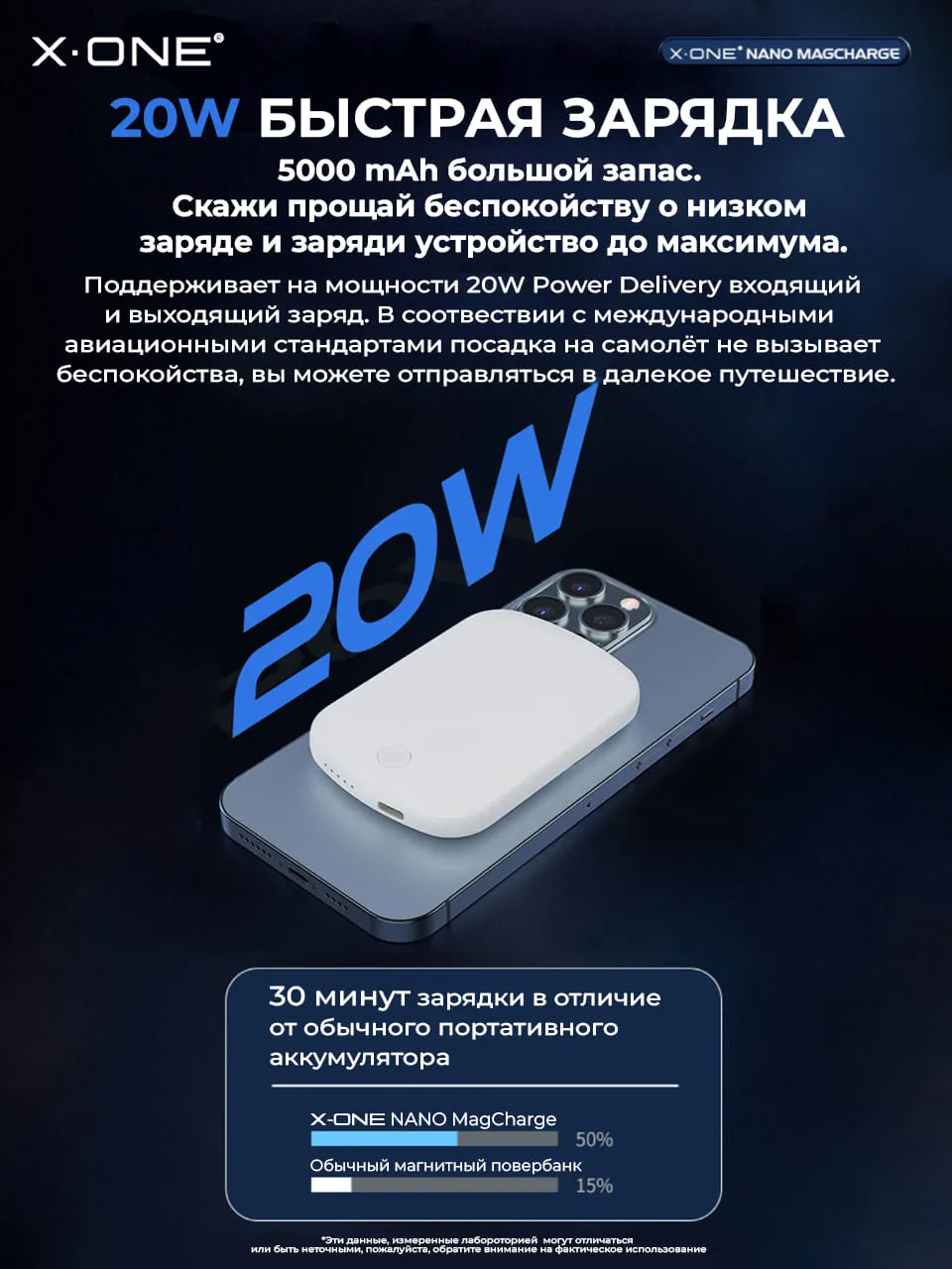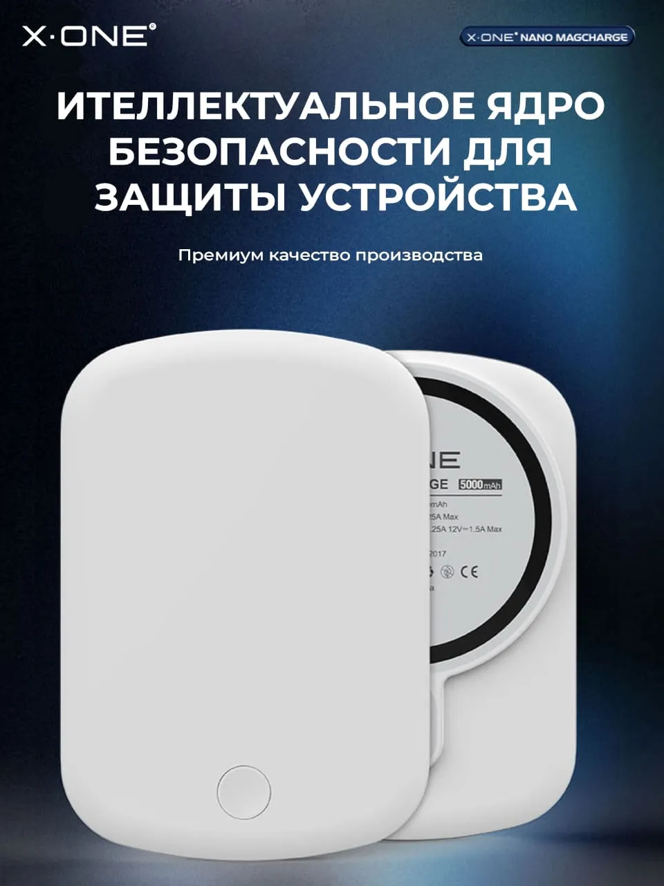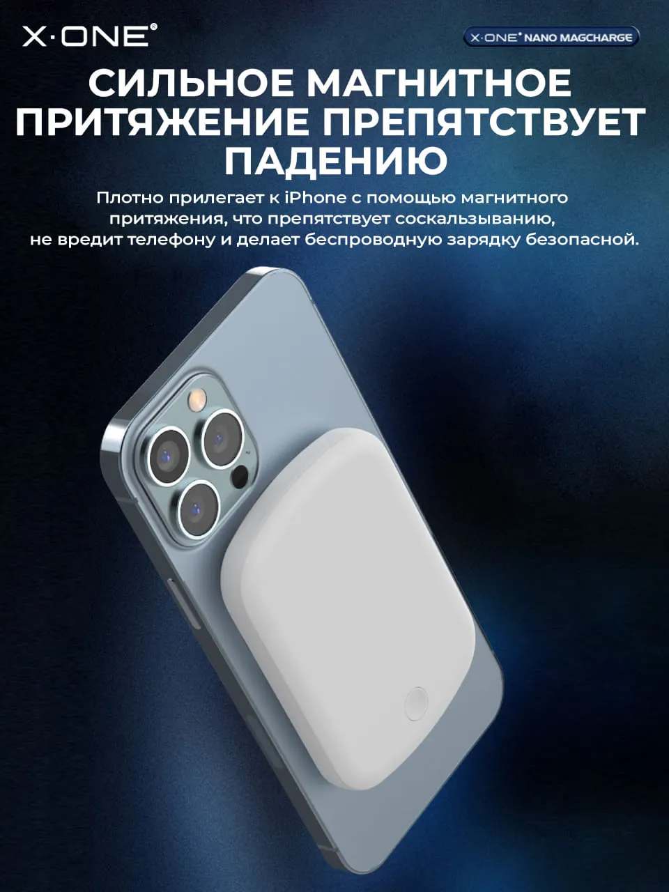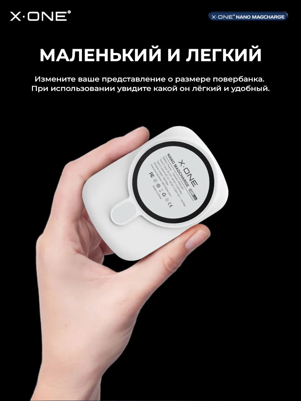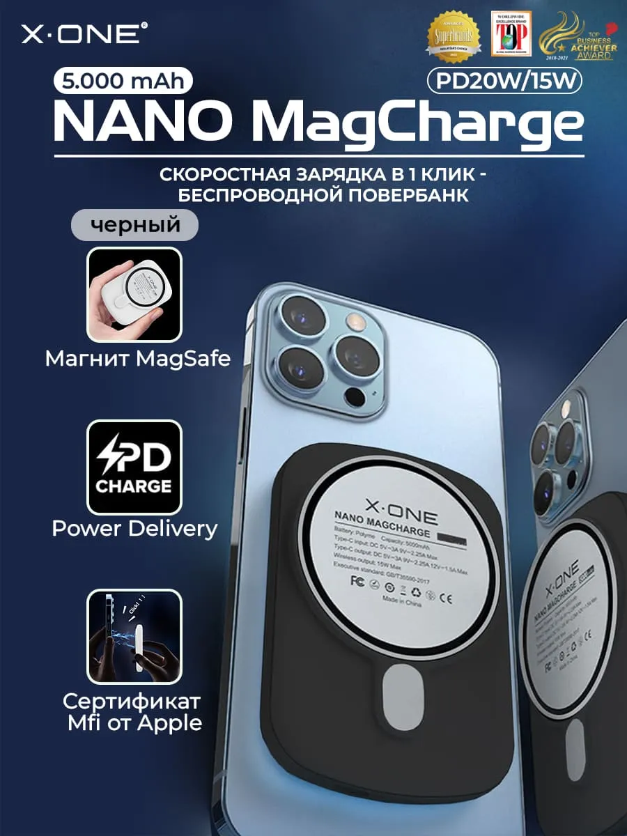 Беспроводной быстро зарядный повербанк X-ONE Nano MagCharge Powerbank 5000 mAh с мощным магнитом для стыковки с телефоном и зарядки в один клик, удерживает внешний аккумулятор на телефоне без риска падения.