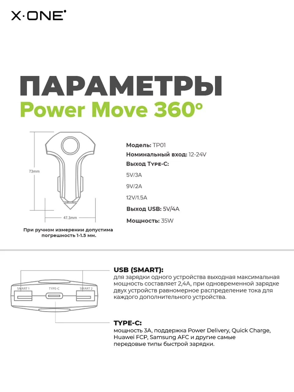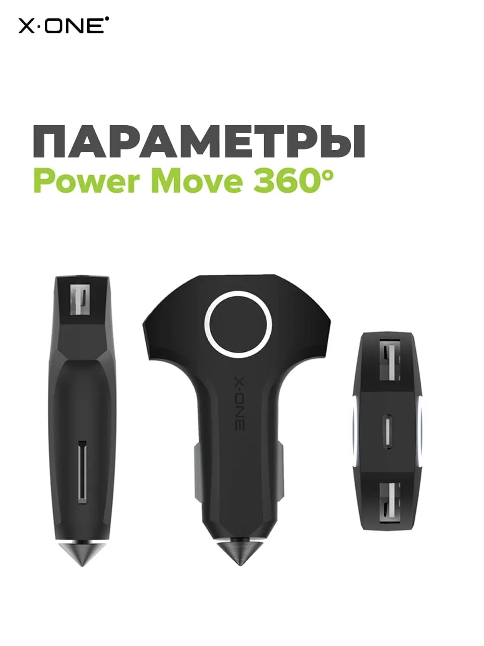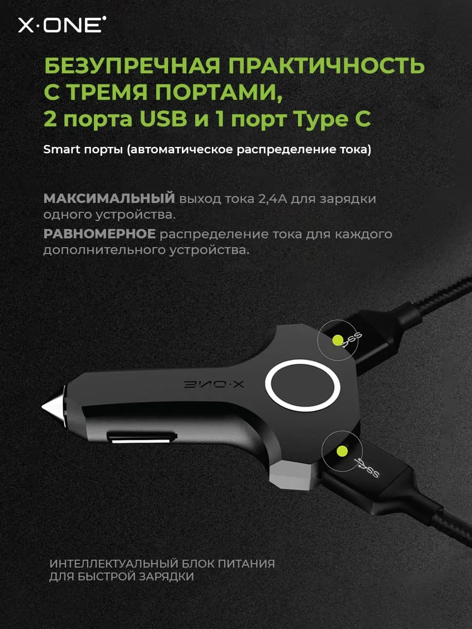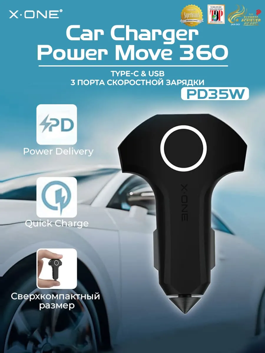 Автомобильная быстрая зарядка X-ONE Power Move 360 / 1-порт Type-C и 2-порта USB / блок питания в прикуриватель / поддержка Power Delivery и Quick Сharge