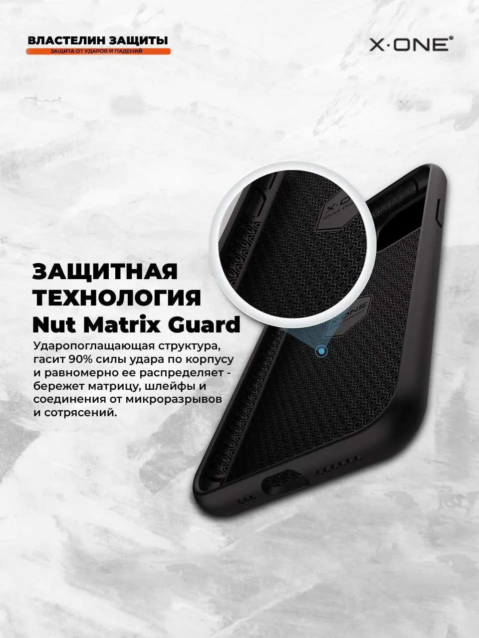 Nut Matrix Guard — технология ударопоглощающей структуры, гасит 90% силы удара по корпусу и равномерно ее распределяет — защищает матрицу, шлейфы и соединения от микро-разрывов и сотрясений.