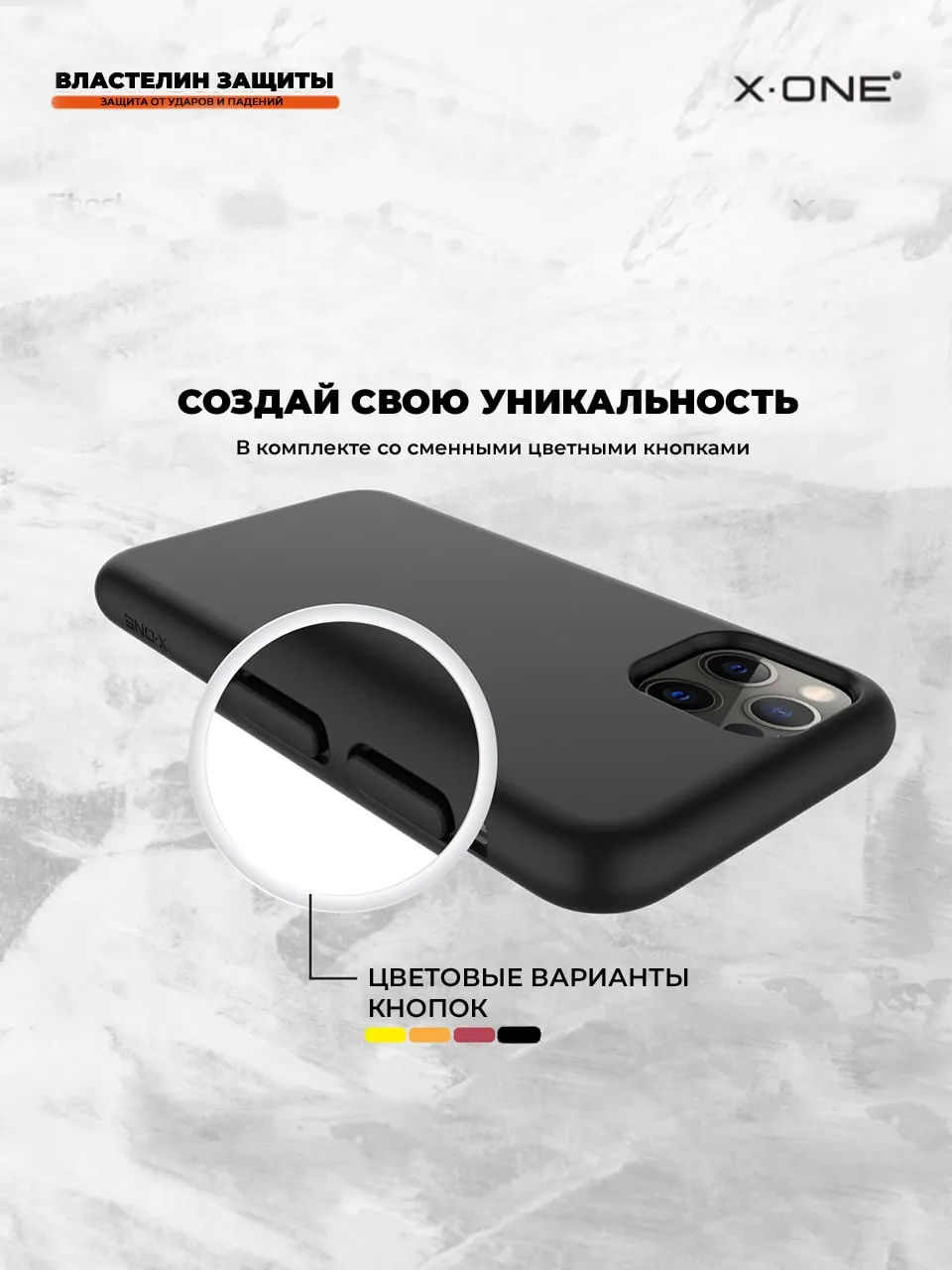 Закрытый чехол X-ONE Shock Dominator с матовым Soft-Touch корпусом и сменными цветными кнопками в комплекте.