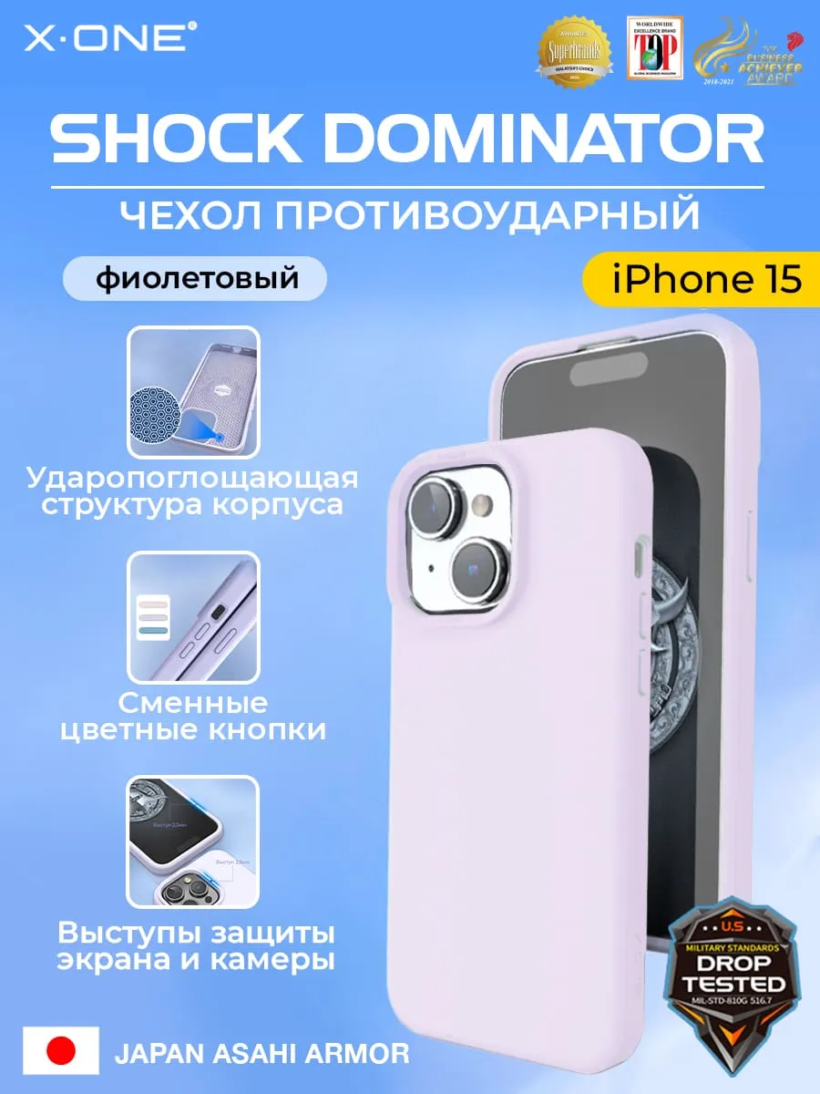Чехол iPhone 15 X-ONE Shock Dominator - фиолетовый закрытый матовый Soft Touch корпус и сменные цветные кнопки в комплекте