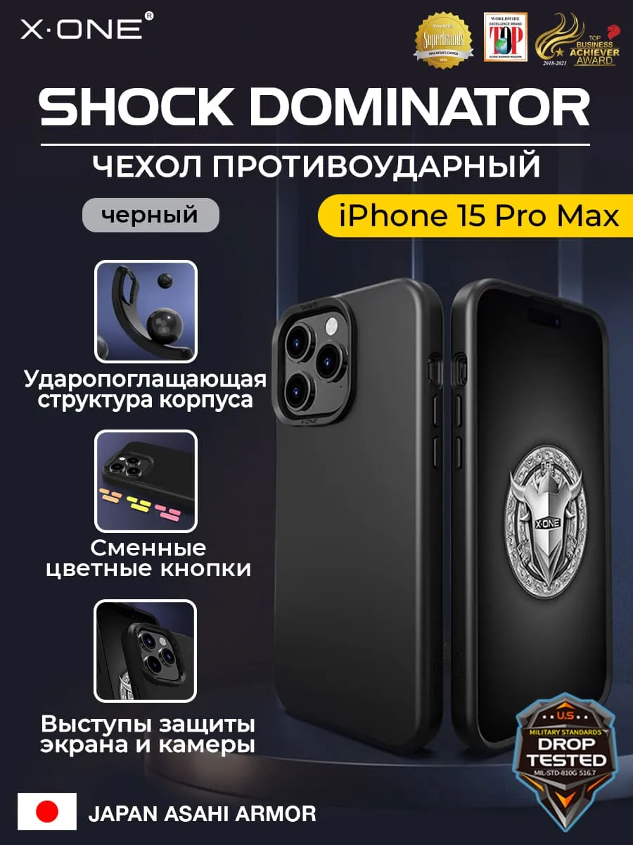 Чехол iPhone 15 Pro Max X-ONE Shock Dominator - черный закрытый матовый Soft Touch корпус и сменные цветные кнопки в комплекте