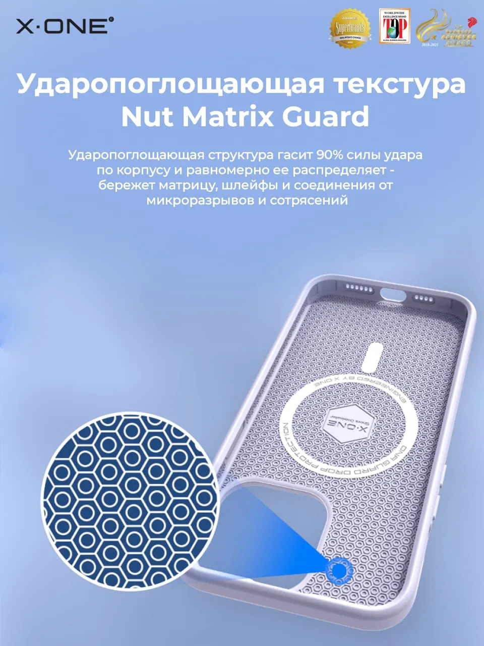 Nut Matrix Guard — технология ударопоглощающей структуры, гасит 90% силы удара по корпусу и равномерно ее распределяет — защищает матрицу, шлейфы и соединения от микро-разрывов и сотрясений.