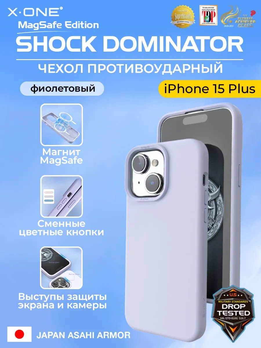 Чехол iPhone 15 Plus X-ONE Shock Dominator MagSafe - фиолетовый закрытый матовый Soft Touch корпус и сменные цветные кнопки в комплекте
