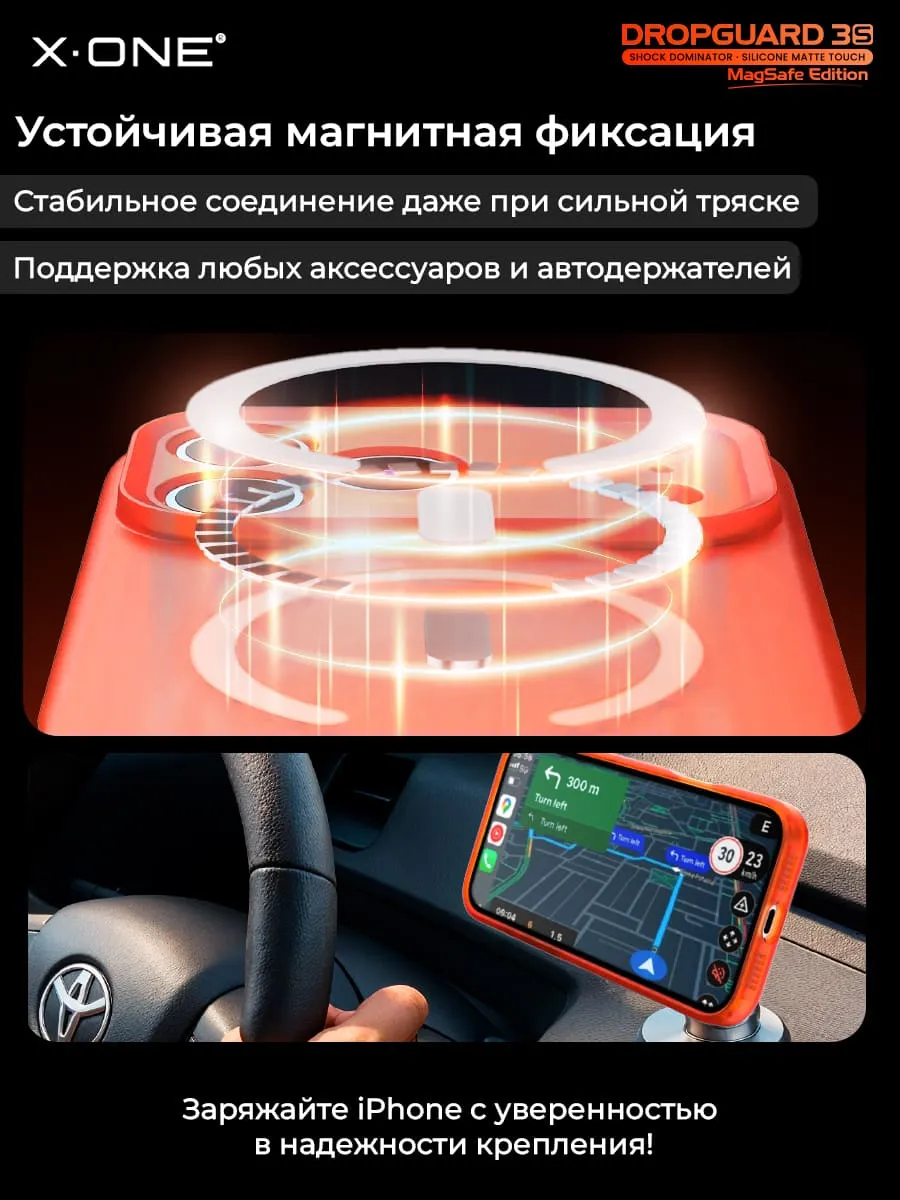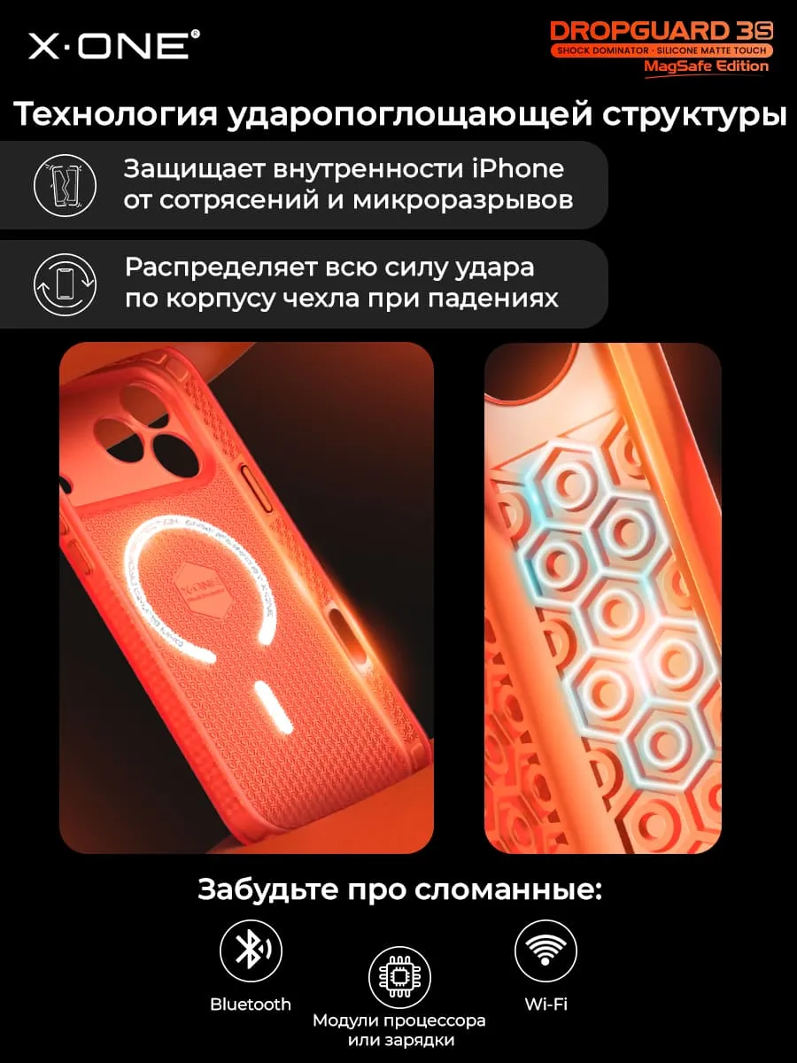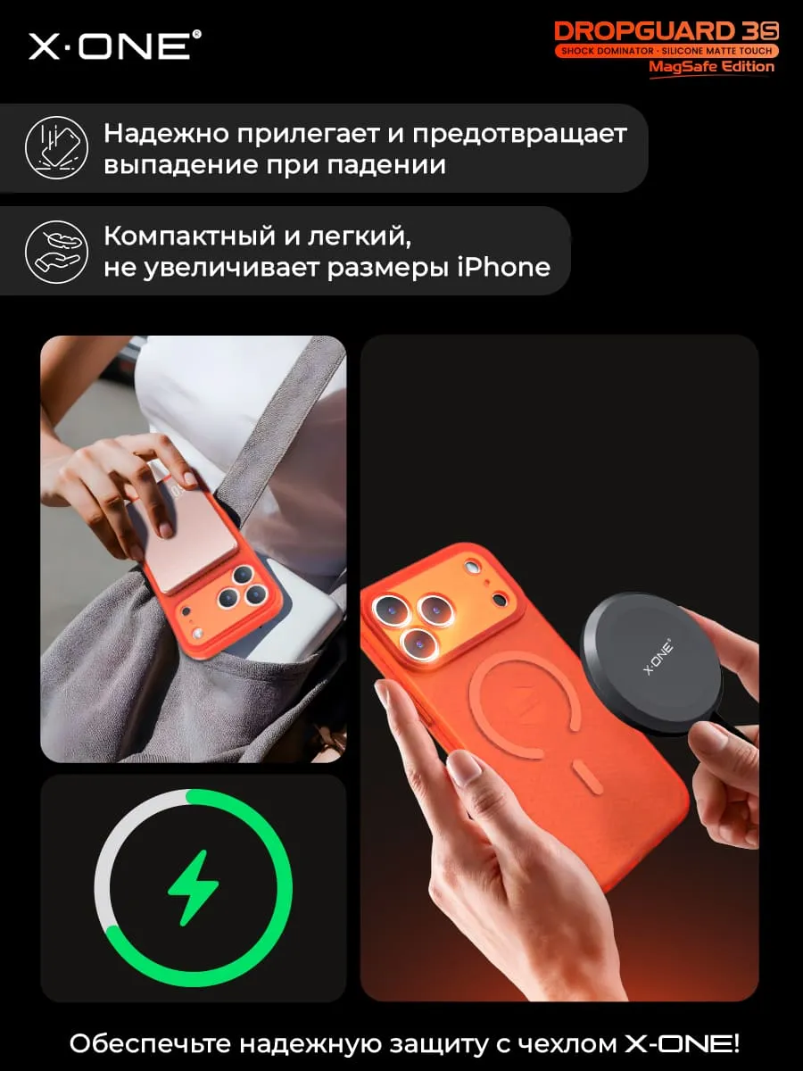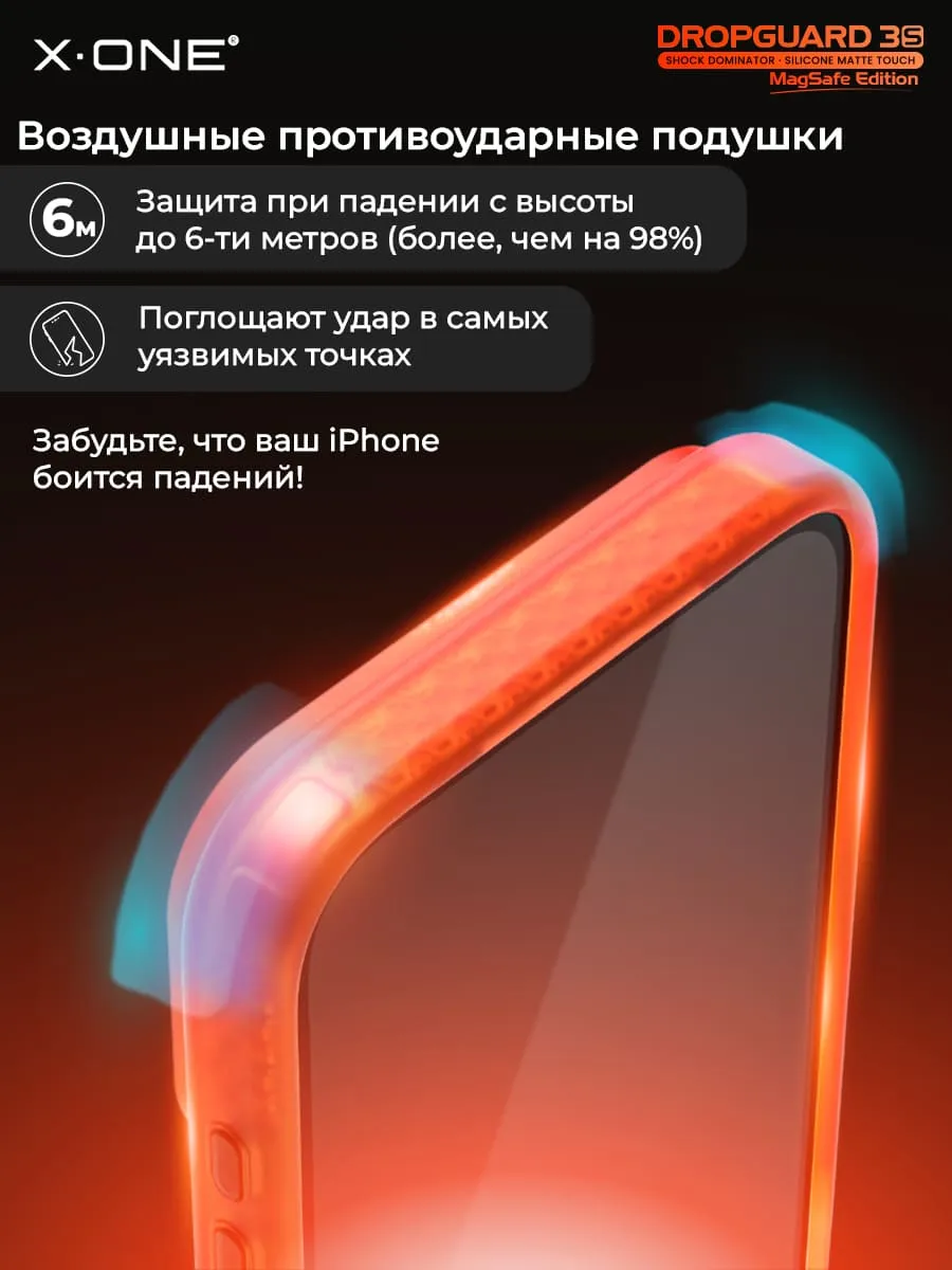 Противоударный чехол X-ONE DropGuard 3S с полупрозрачным Soft-Touch корпусом, сменными цветными кнопками в комплекте и магнитом MagSafe для беспроводной зарядки.
