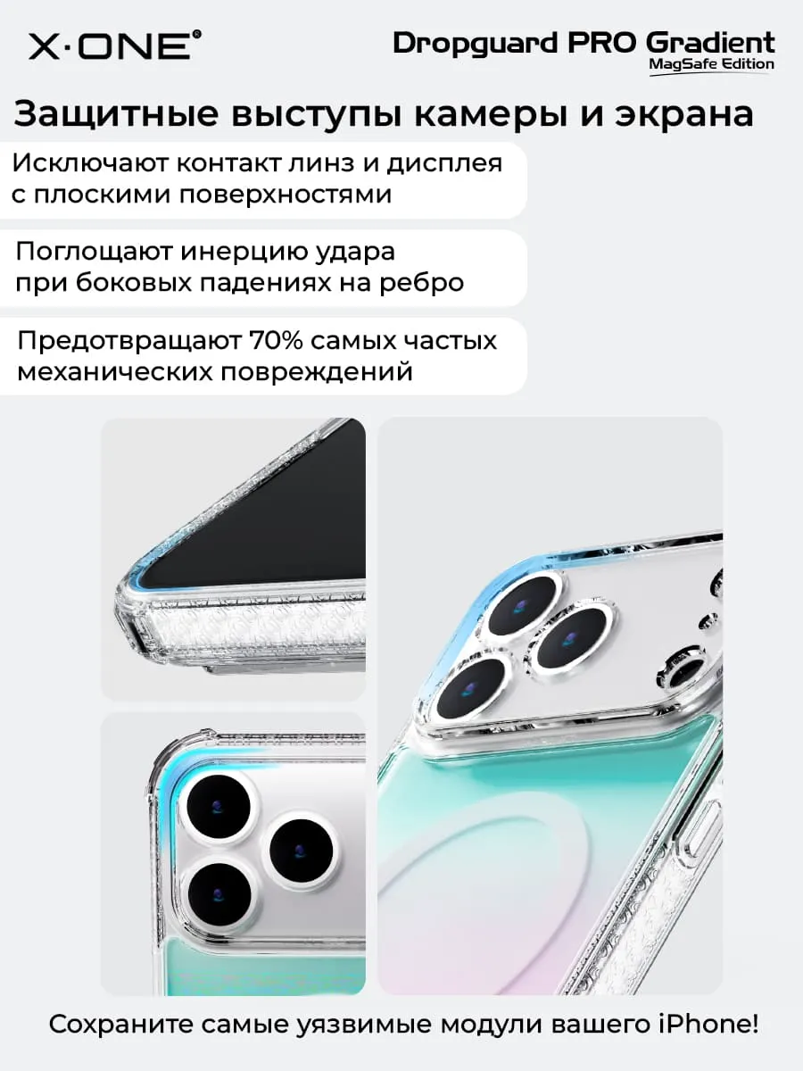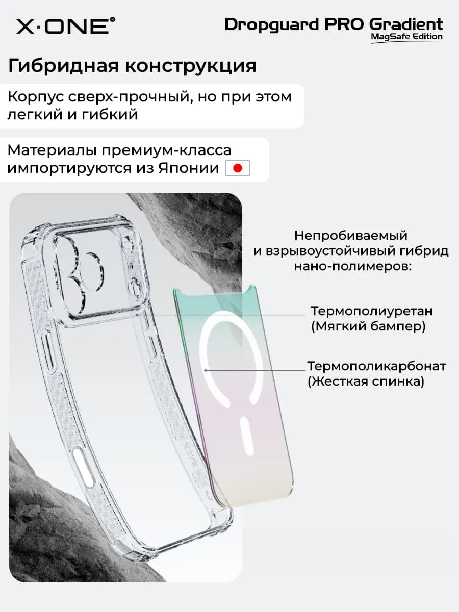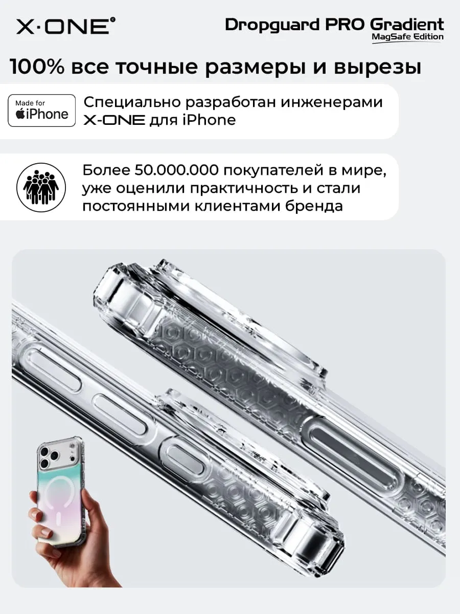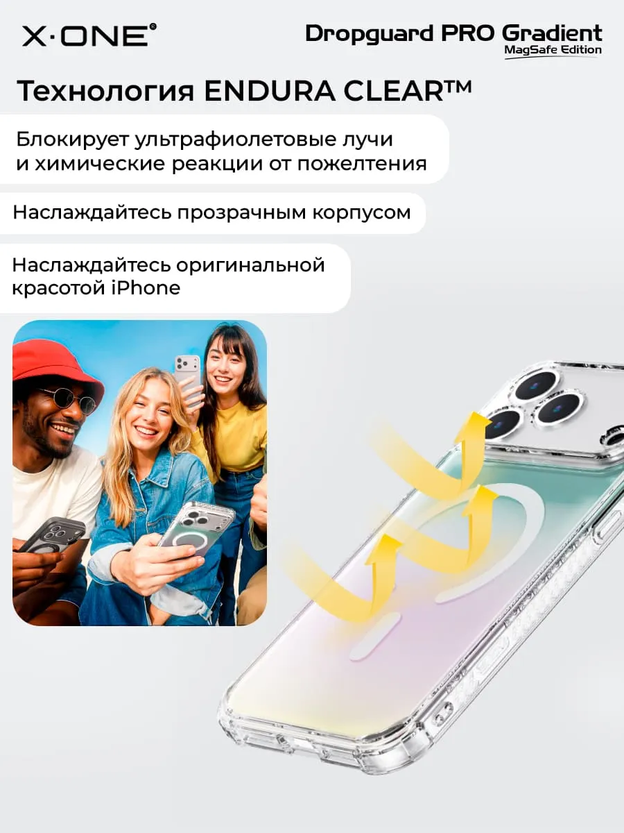 Прозрачный чехол X-ONE DropGuard PRO Gradient MagSafe с кристально-прозрачным текстурированным боковым корпусом, задней панелью палитры цветов северного сияния и магнитом MagSafe для беспроводной зарядки.