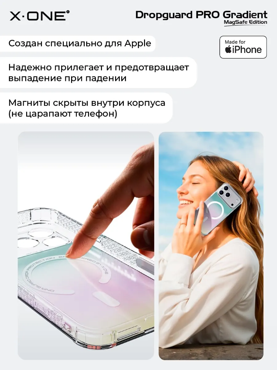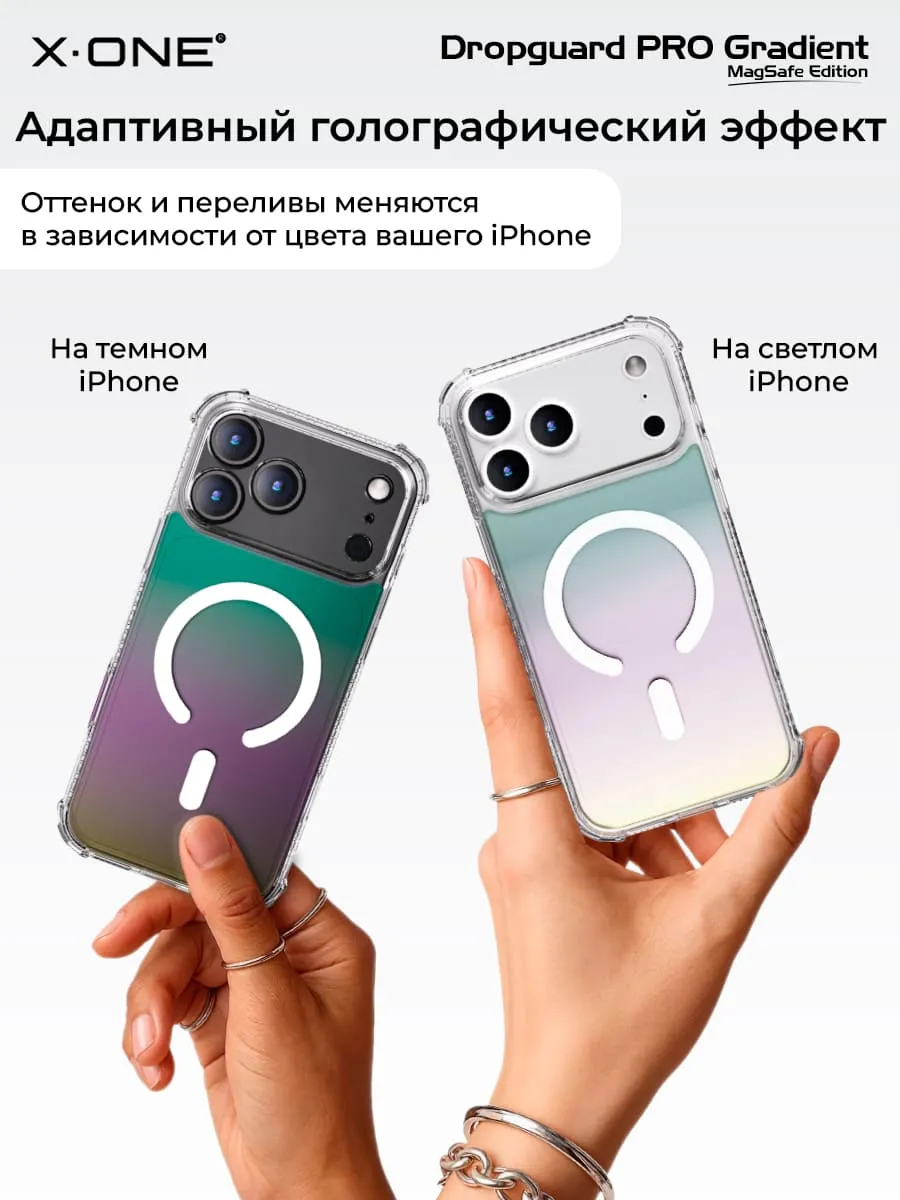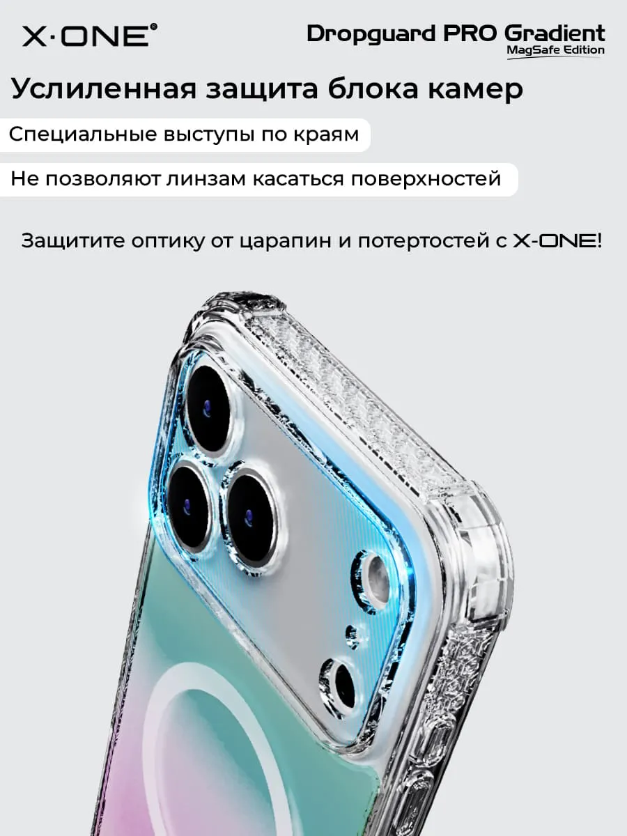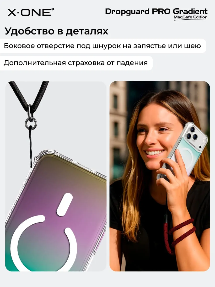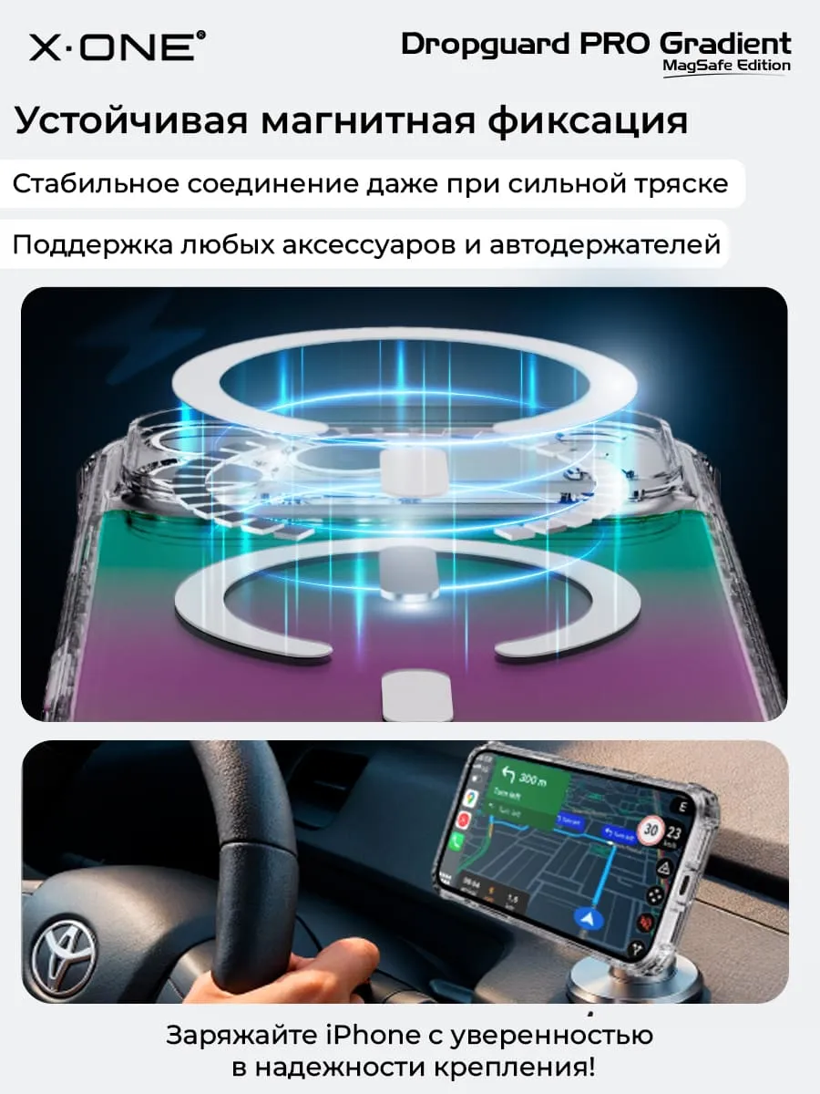 Прозрачный чехол X-ONE DropGuard PRO Gradient MagSafe с кристально-прозрачным текстурированным боковым корпусом, задней панелью палитры цветов северного сияния и магнитом MagSafe для беспроводной зарядки.