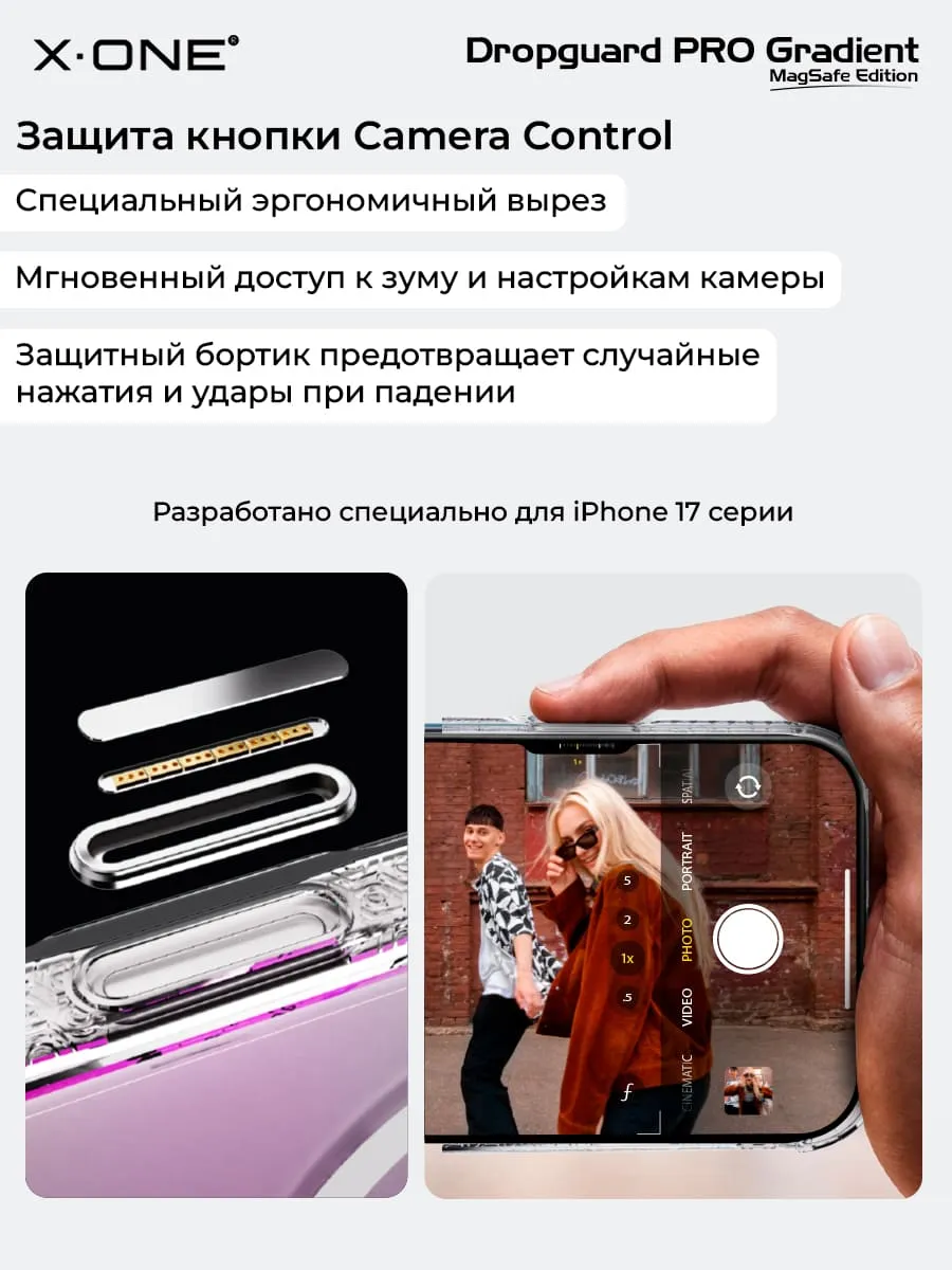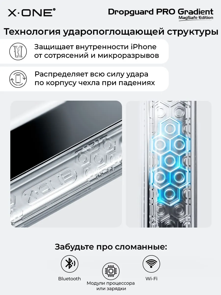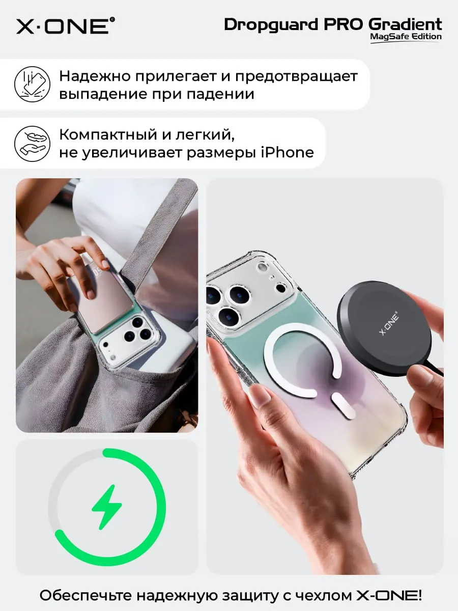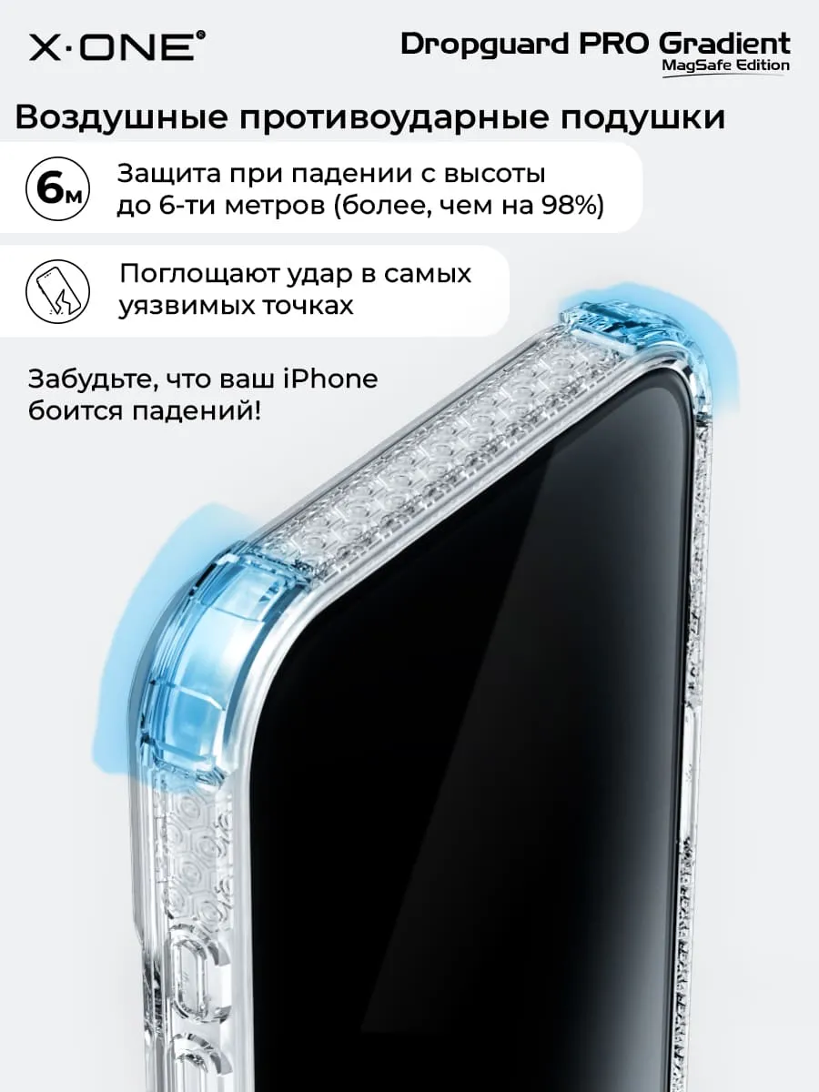 Прозрачный чехол X-ONE DropGuard PRO Gradient MagSafe с кристально-прозрачным текстурированным боковым корпусом, задней панелью палитры цветов северного сияния и магнитом MagSafe для беспроводной зарядки.