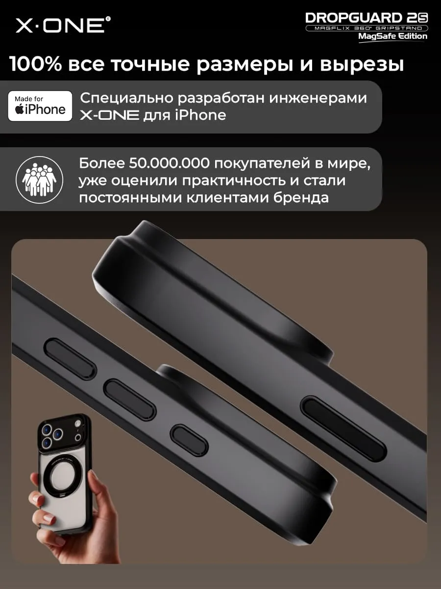 Противоударный чехол X-ONE DropGuard 2S с прозрачной задней панелью, черным матовым Soft-Touch бампером, дизайнерский магнит MagSafe с поворотом в 360° используемый для беспроводной зарядки + как подставка телефона, в комплекте карбоновый стикер для установки на заднюю панель по усмотрению.