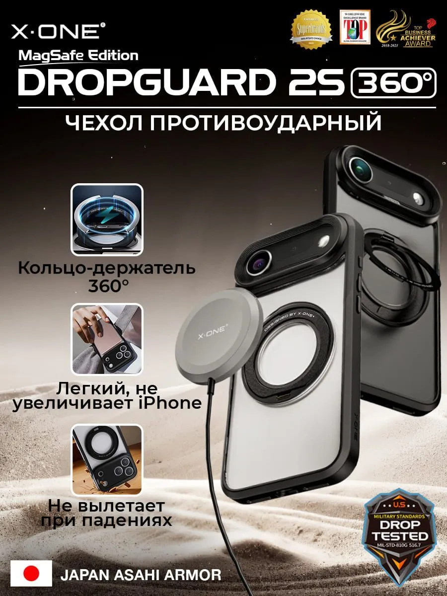 Чехол iPhone 17 Air X-ONE DropGuard 2S MagSafe 360° магнитное кольцо с подставкой / прозрачная задняя панель и черный матовый бампер