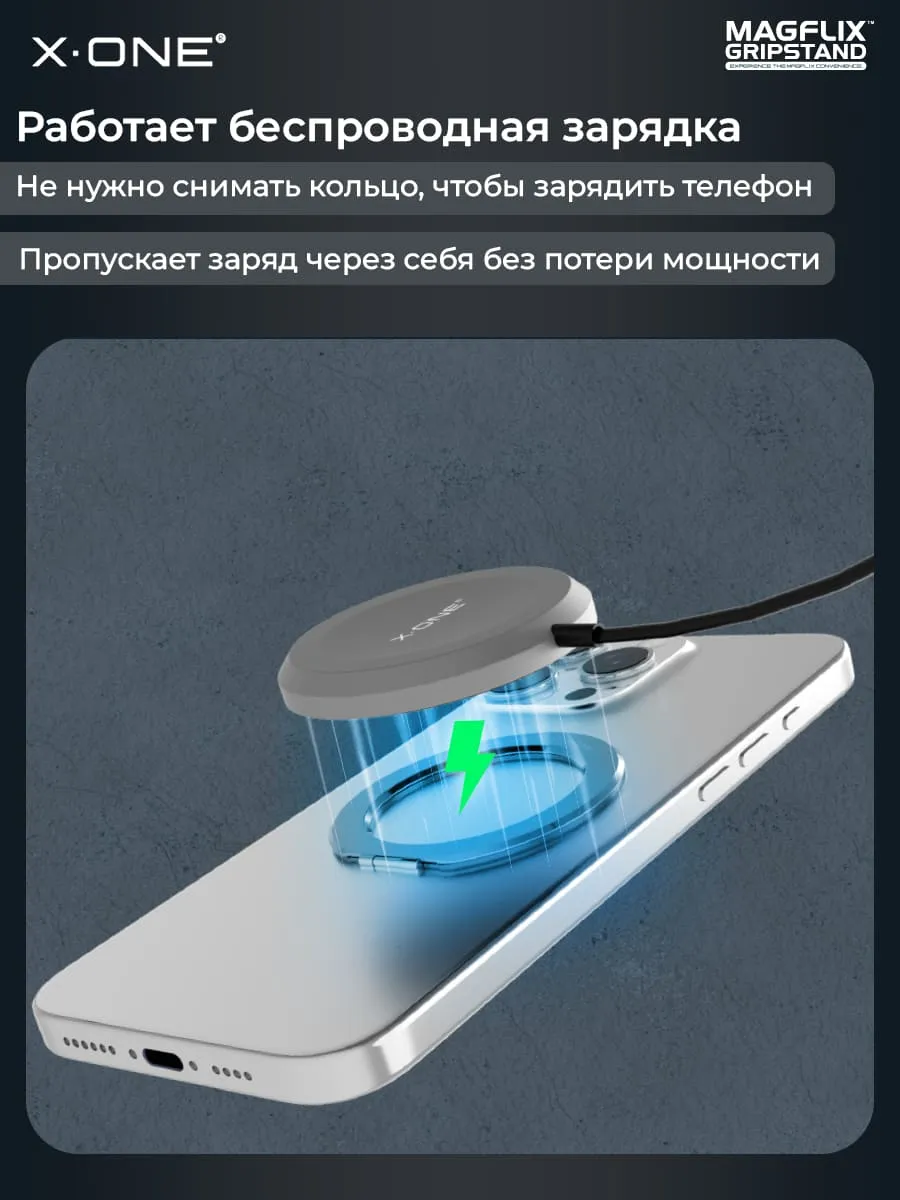 MagFlix Gripstand поддерживает беспроводную зарядку — аксессуар пропускает заряд через себя без потери мощности, поэтому нет необходимости снимать кольцо при зарядке устройства.