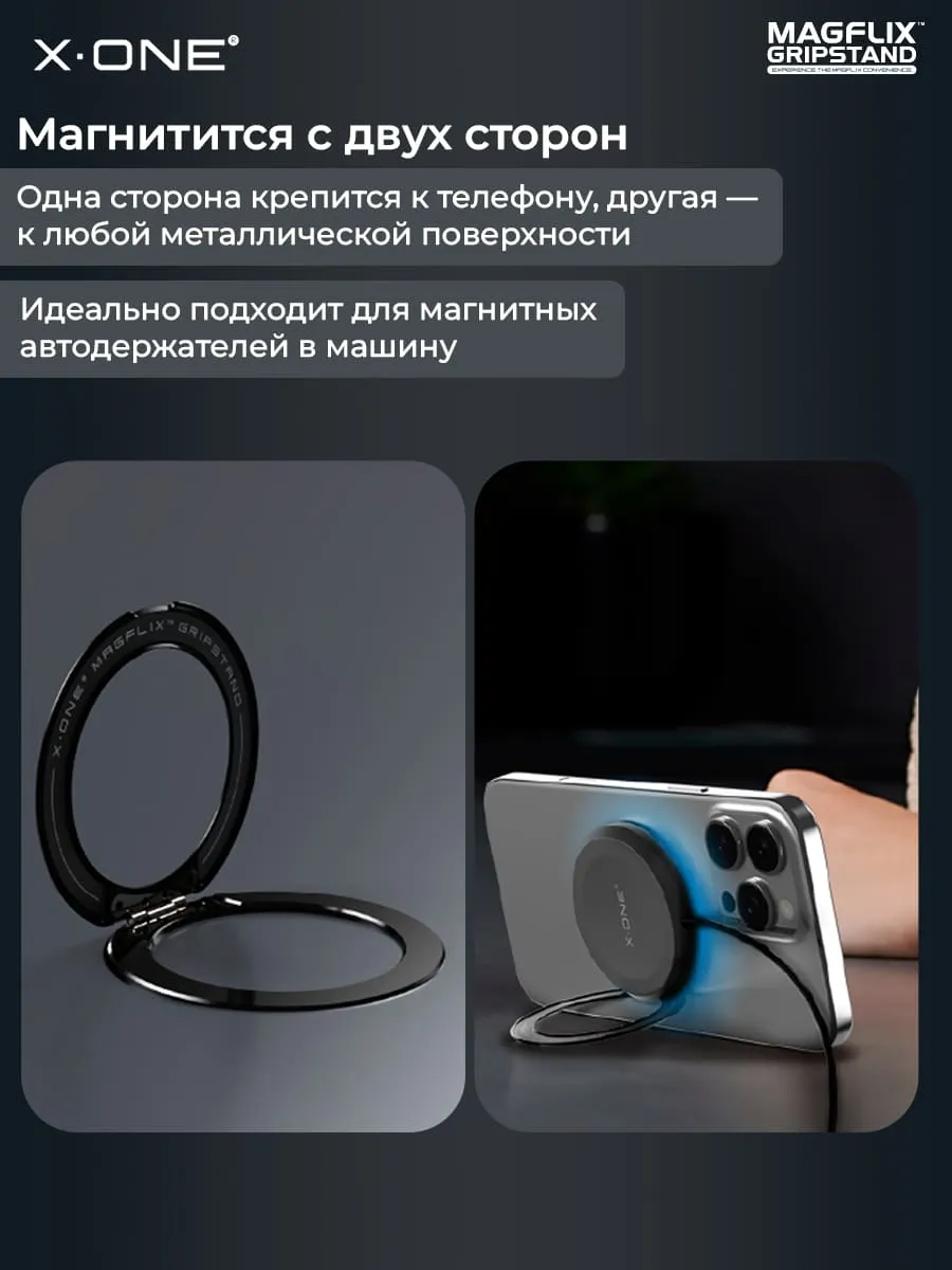 Универсальное магнитное кольцо-держатель с функцией подставки X-ONE MagFlix Gripstand делает использование смартфона более удобным и безопасным. Компактный аксессуар сочетает в себе надежный магнитный держатель, удобный грип для руки и функциональную подставку для просмотра контента.