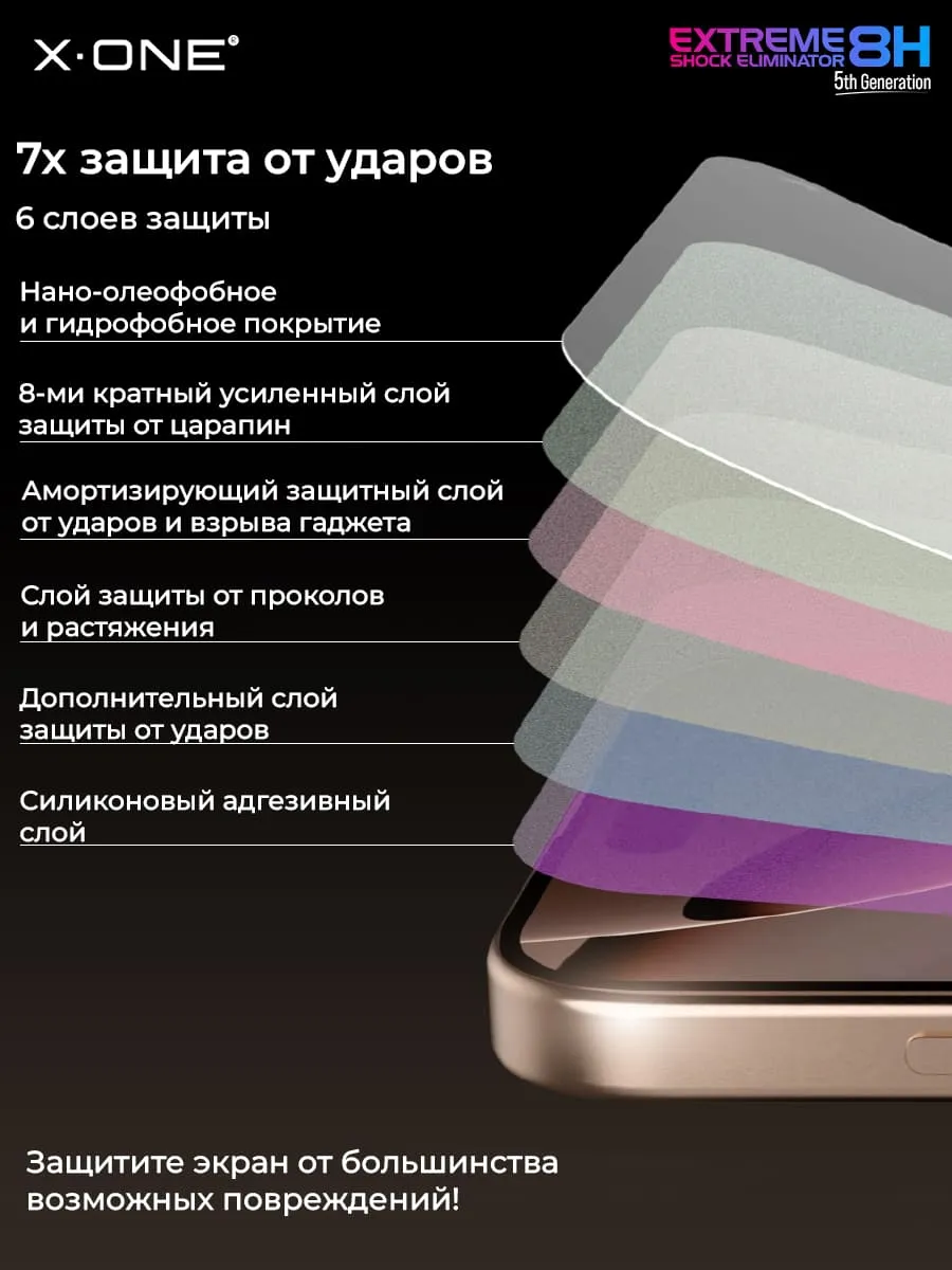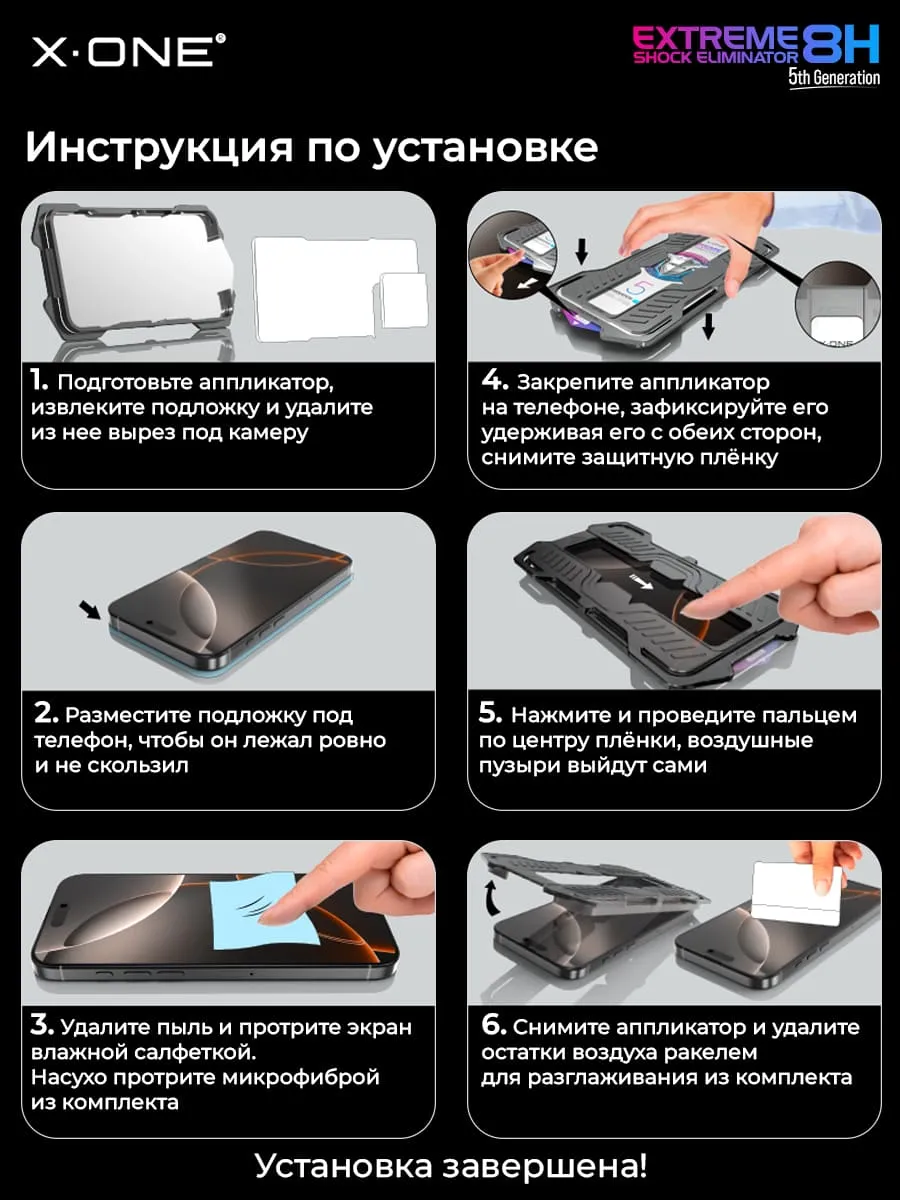 - Комплектация: Фирменный кейс - упаковка X-ONE, защитная пленка - 1 шт., салфетка из микрофибры - 1 шт., салфетка спиртовая - 1 шт., стикеры пылесборные/установочные, установочный аппликатор - 1 шт., QR код с видео-инструкцией по установке на упаковке