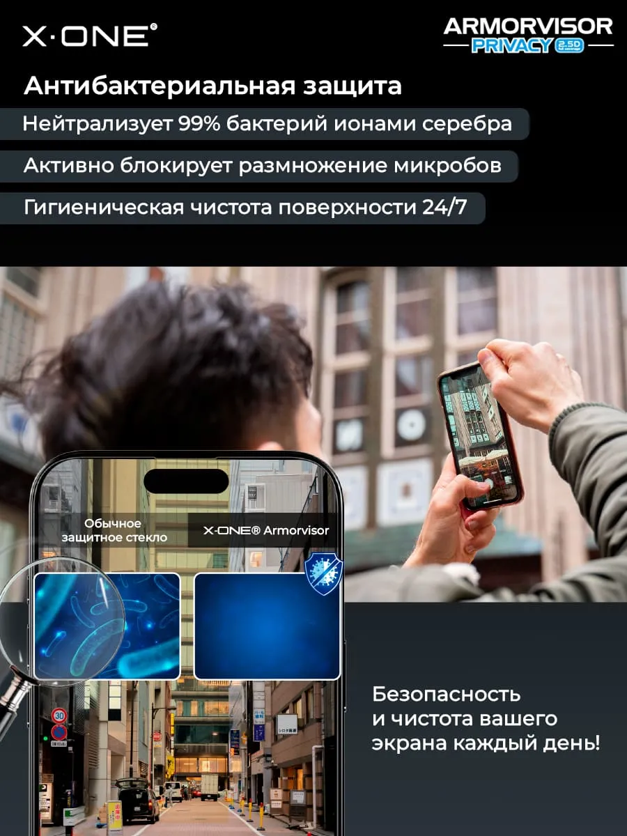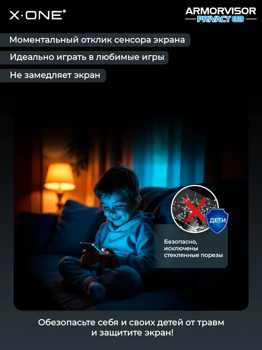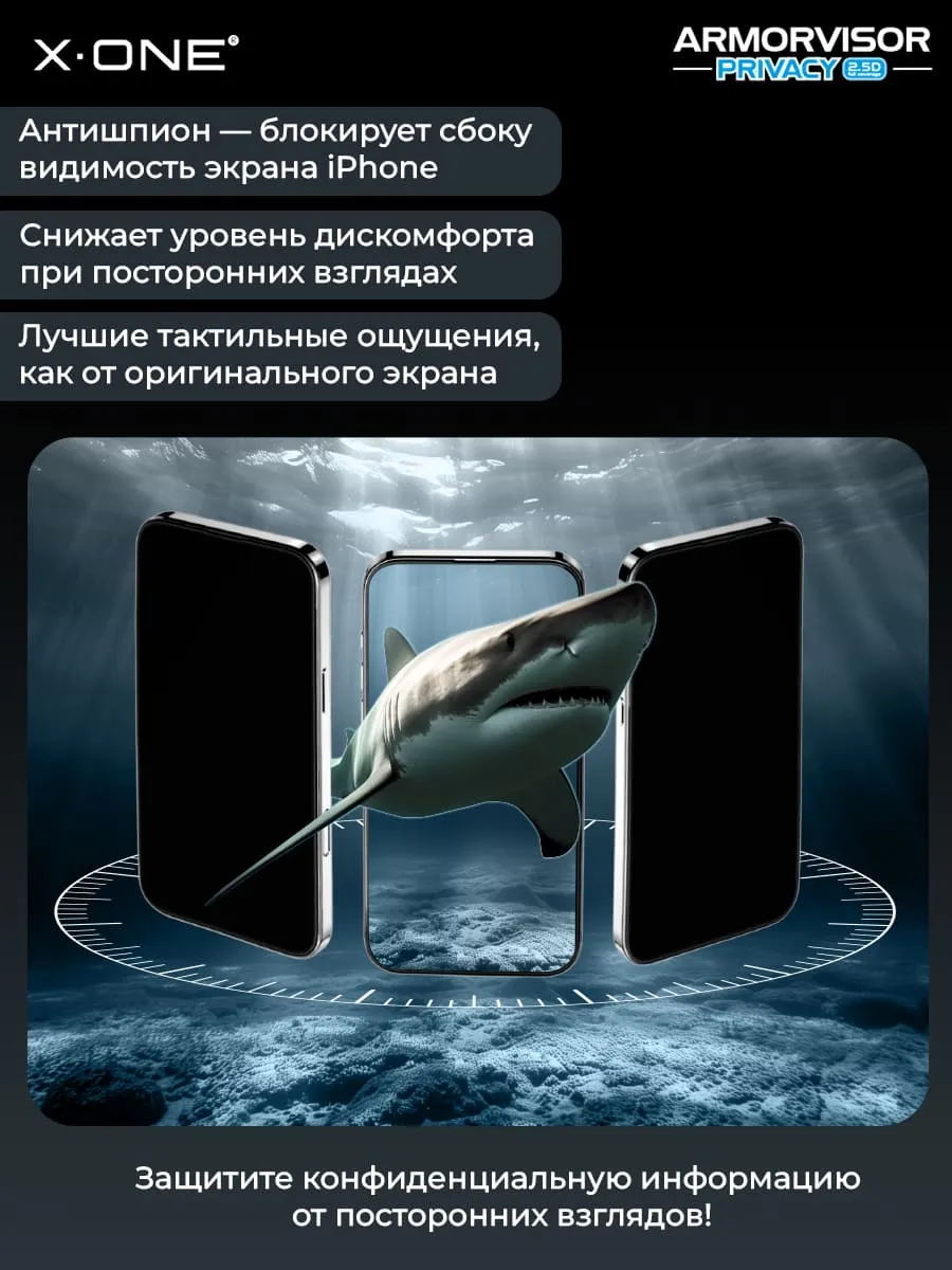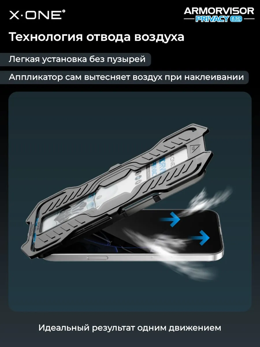 Противоударная бронепленка — Антишпион / с защитой от подглядывания X-ONE Armorvisor Privacy 4-го поколения с аппликатором для легкой и точной установки в 2 касания, на ощупь и по плотности, как стекло — защитная пленка с фильтрацией ультрафиолетового излучения экрана.