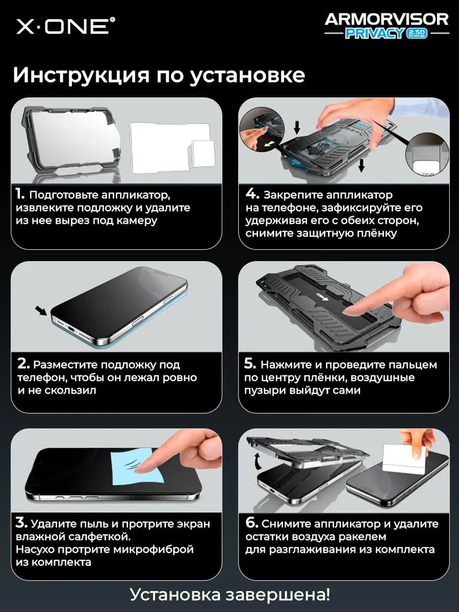 - Комплектация: Фирменный кейс - упаковка X-ONE, защитная пленка - 1 шт., салфетка из микрофибры - 1 шт., салфетка спиртовая - 1 шт., стикеры пылесборные/установочные, установочный аппликатор - 1 шт., QR код с видео-инструкцией по установке на упаковке