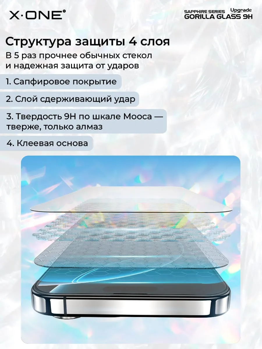 Сапфировое стекло с гарантией на экран вашего iPhone - 3 месяца X-ONE Sapphire 9H (upgrade) с фильтром защиты динамика и аппликатором для легкой и ровной установки в 2 касания, без остатков пыли - защитное стекло, толщиной всего 0.2мм.
