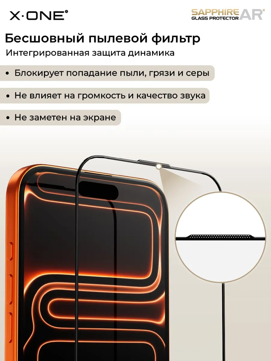 Сапфировое стекло iPhone 16 Plus/15 Plus X-ONE Sapphire AR+ Glass Protector / с фильтром защиты динамика от грязи / противоударное / с установочным аппликатором