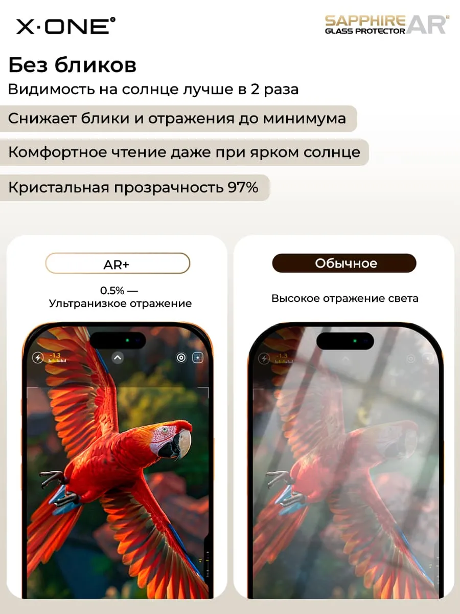 Новинка 2026 X-ONE среди защитных стекол с гарантией на экран вашего iPhone - 3 месяца. Антибликовое сапфировое стекло X-ONE Sapphire AR+ с фильтром защиты динамика и аппликатором для легкой и ровной установки в 2 касания, без остатков пыли - защитное стекло.